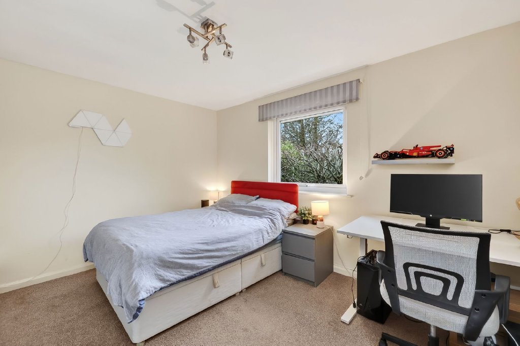 The property offers five well-proportioned bedrooms in total, complemented by three bath and shower rooms. The principal bedroom enjoys a sunny southerly aspect with sliding doors opening directly onto the garden terrace, along with a walk-in wardrobe and stylish en-suite. The remaining bedrooms are generously sized doubles, served by a contemporary family bathroom and a separate wet room, both finished with modern fittings and tasteful tiling.