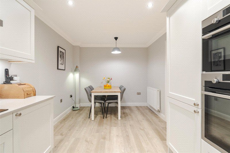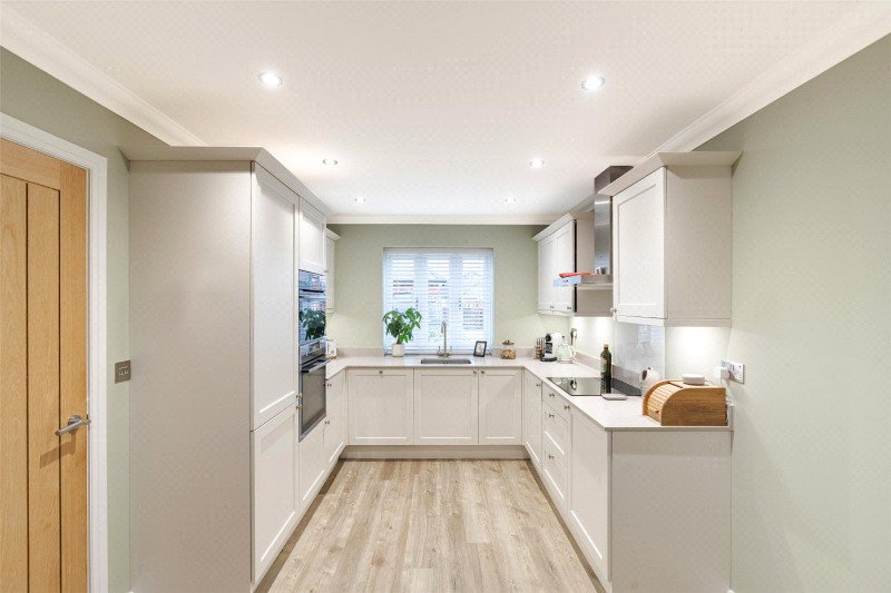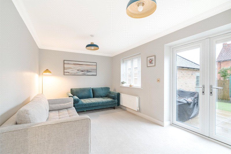 There is a lovely kitchen/dining room comprising a good range of cream Shaker style units (with chrome knobs) complemented by quartz worktops, a stainless steel butler’s sink with mixer tap, AEG oven and combination oven/microwave, Neff induction hob with extractor over, integrated dishwasher and fridge/freezer, space for washing machine, Amtico flooring and space for table and chairs. The sitting room enjoys an outlook over the rear garden. A patio door opens onto a patio ideal for al fresco dining.