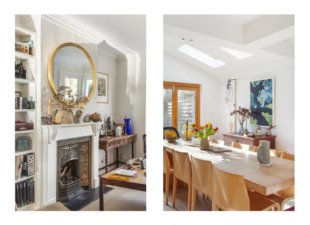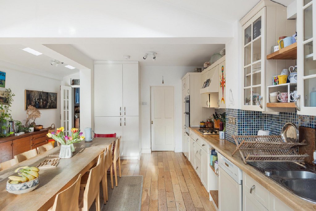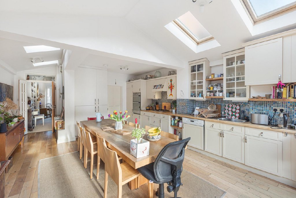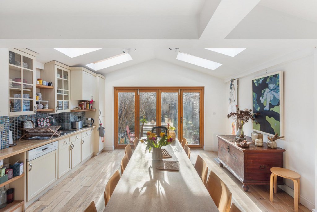 The ground floor offers wonderfully balanced living and entertaining space, featuring an impressive 25-foot through reception and dining room with a gas fireplace, a downstairs cloakroom/WC, and a substantial kitchen and dining extension. The kitchen is flooded with natural light and opens seamlessly onto the secluded south facing garden via fully retractable tri-fold patio doors, creating an exceptional indoor-outdoor flow ideal for modern family living.