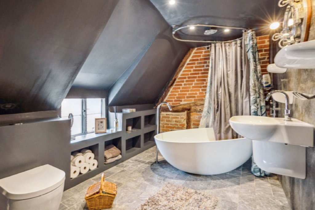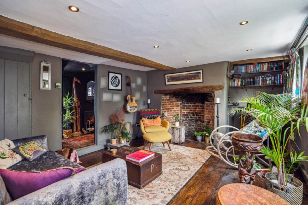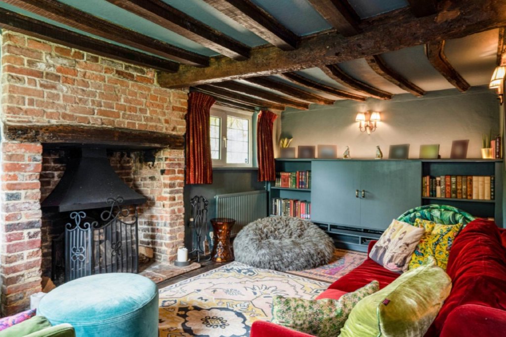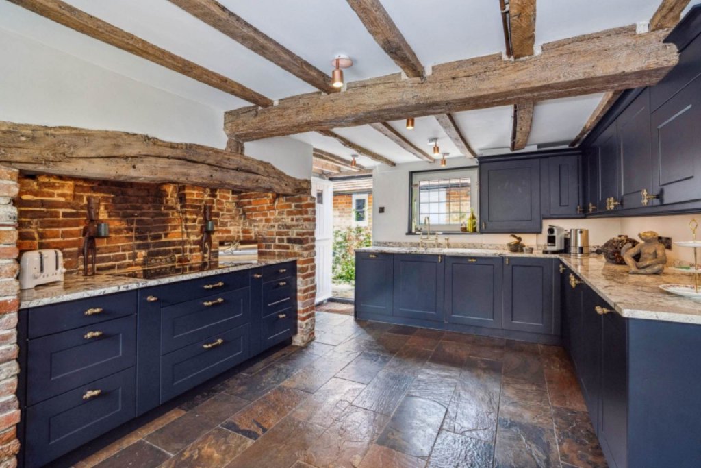 The property sits behind high-level fencing with a gated entrance opening onto generous courtyard parking and a security gate providing access to the side entrance. To the front of the house is an elegant sitting room featuring an inglenook fireplace with a canopy and adjacent is a family room with an inglenook fireplace and reclaimed antique floorboards. The kitchen breakfast room offers a good range of bespoke fitted units and the focal point of the kitchen is the inglenook fireplace. Leading on to the dining room there is a wood burning stove and slate flooring. The snug/library is fitted with bespoke bookshelves and a wood burning stove. There is a fabulous guest bathroom with Tadelakt Moroccan plaster and bespoke units and finally a useful utility room.