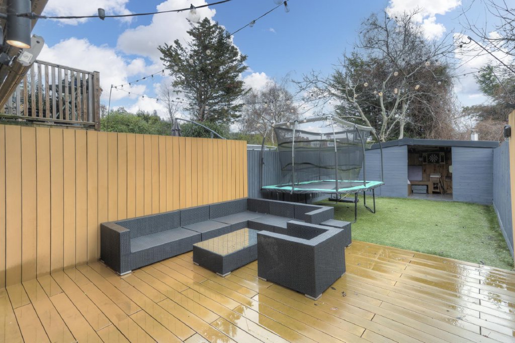 The extremely easy to manage rear garden is designed for outdoor entertaining with a vast decked terrace, an artificial grass area and a storage shed surrounded by close board fencing.