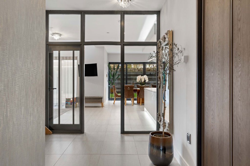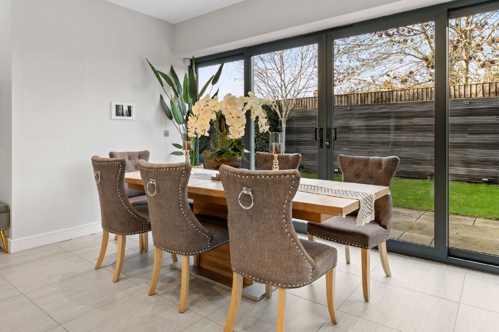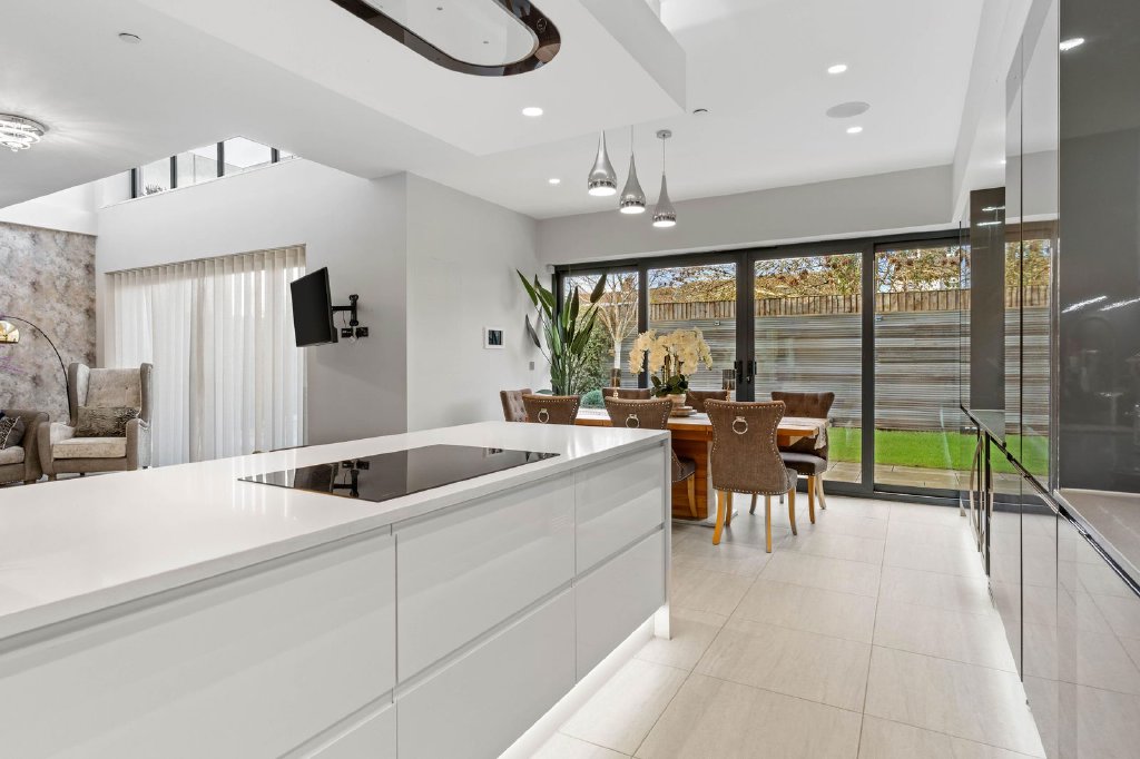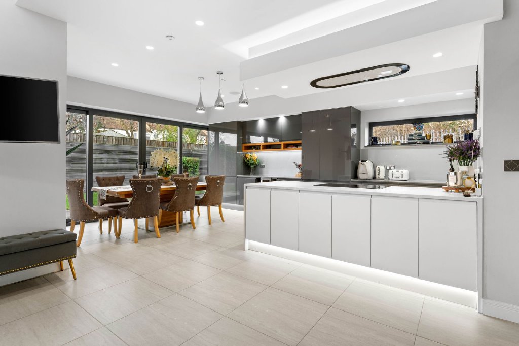 The bespoke Clerkenwell modern kitchen includes a central island with inset hob, built-in double ovens and an integrated dishwasher, finished with sleek worktops and matching splashbacks. The design continues into the dining area, offering additional storage and a built-in wine fridge. The family area benefits from bi-folding doors opening onto the sun terrace and garden.