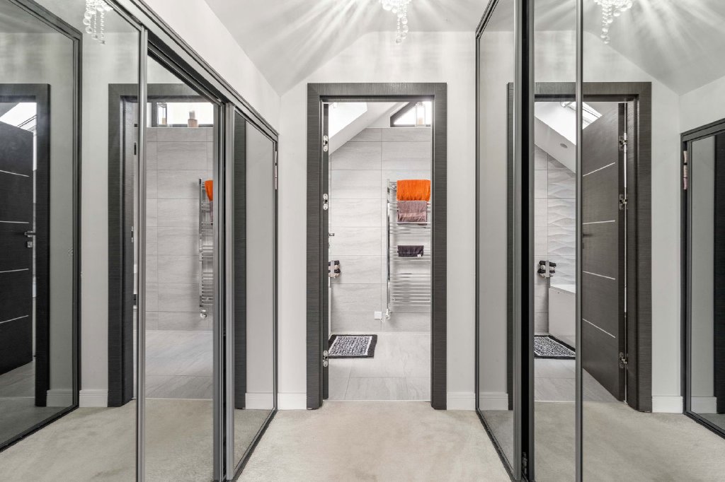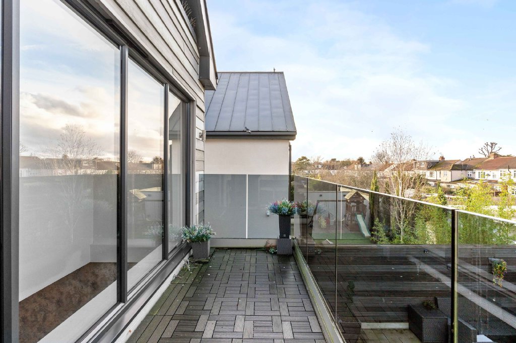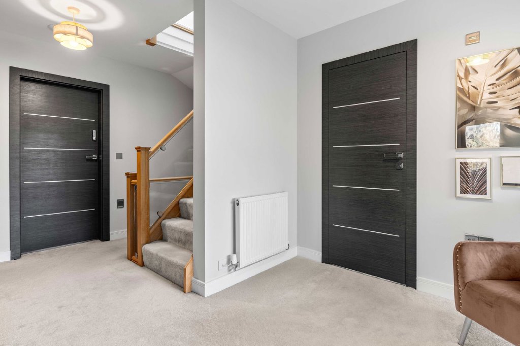 The first floor offers four double bedrooms, including one to the front aspect with a beautifully appointed en-suite, along with a family bathroom and access to an expansive balcony enjoying open views.