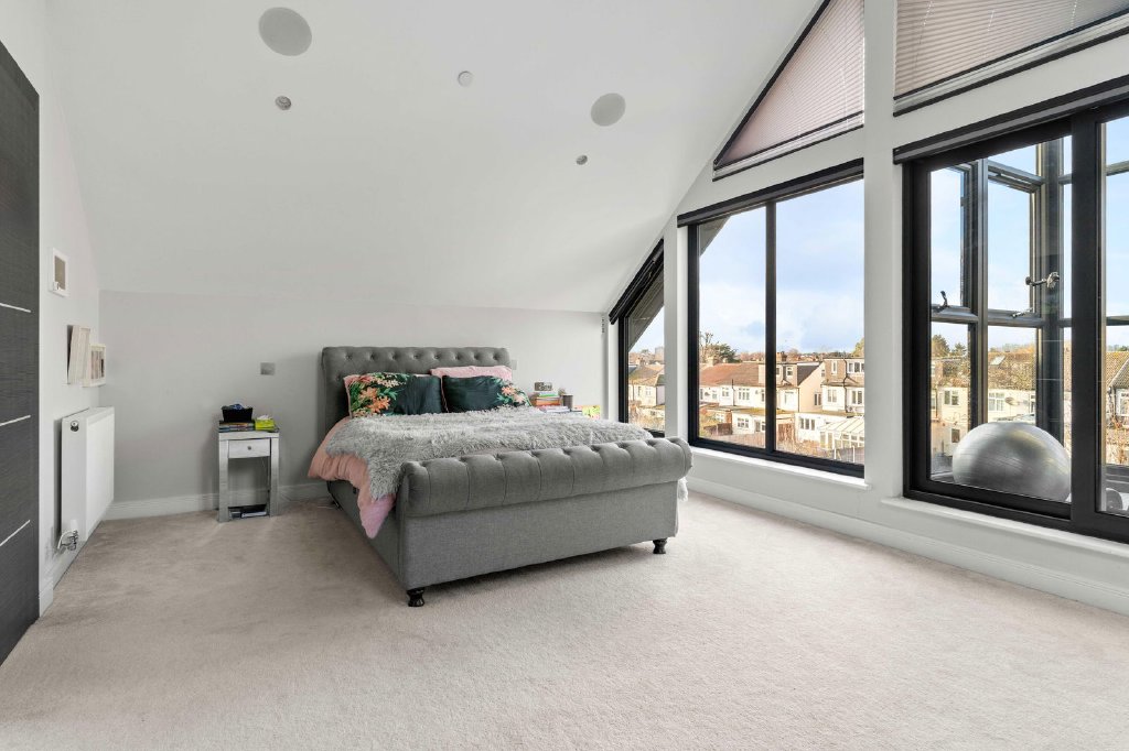 The second floor features an impressive private principal bedroom suite with full-height glazed windows, a purpose-designed gym area, a walk-through dressing room and a spacious en-suite bathroom with separate shower, his and hers vanity basins and its own private shower and steam room.