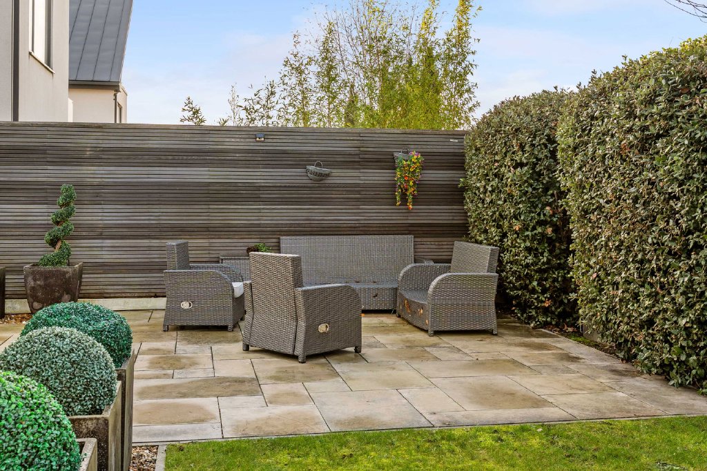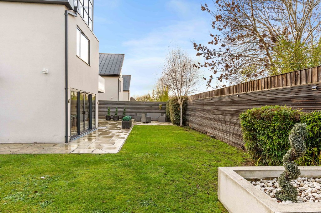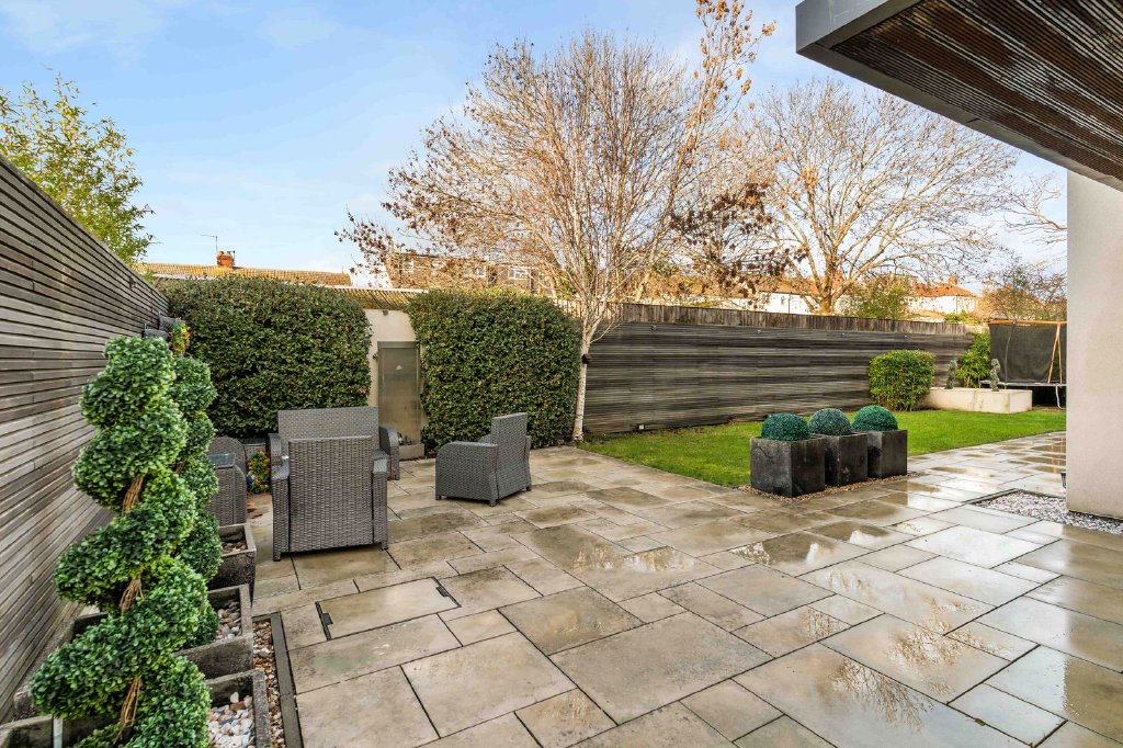 Outside, the private garden is fully enclosed and thoughtfully landscaped, featuring a generous paved terrace ideal for outdoor dining and entertaining, complemented by an area of lawn and attractive raised flower beds.