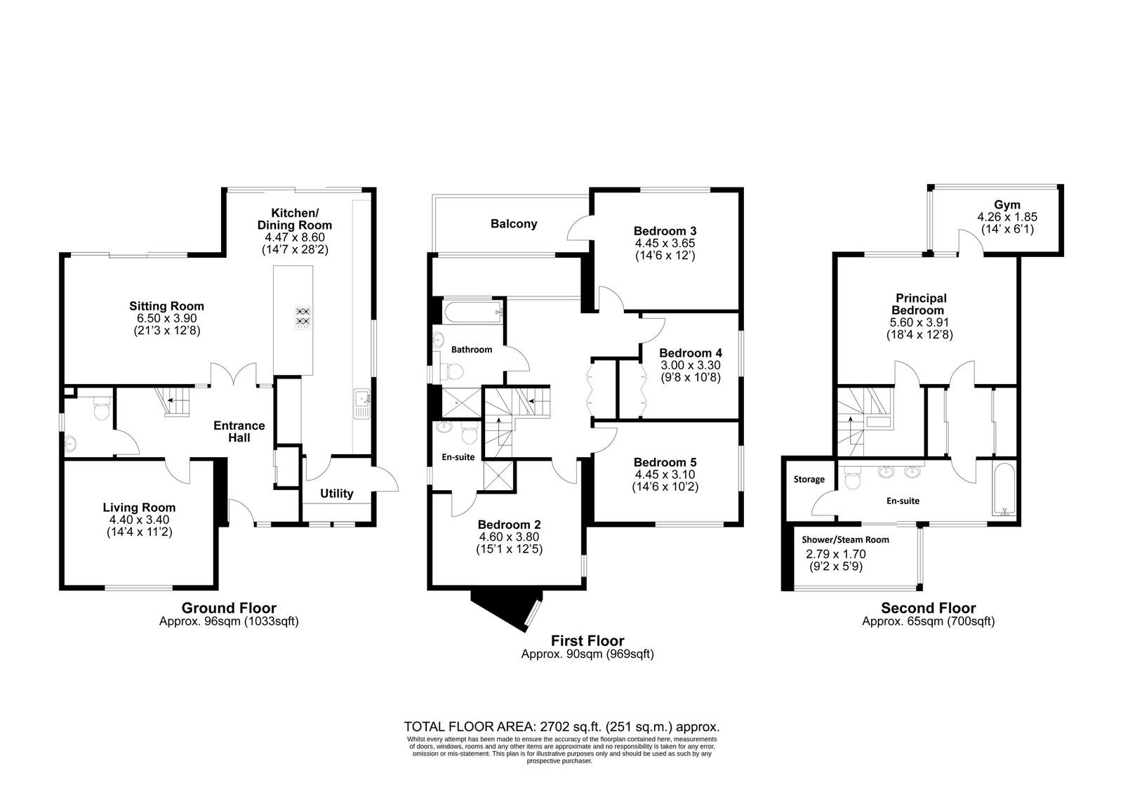 - Five double bedrooms, three bathrooms (en suite/steam room)