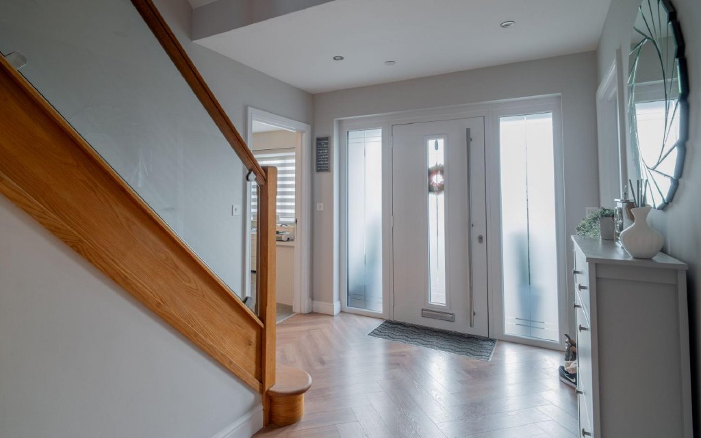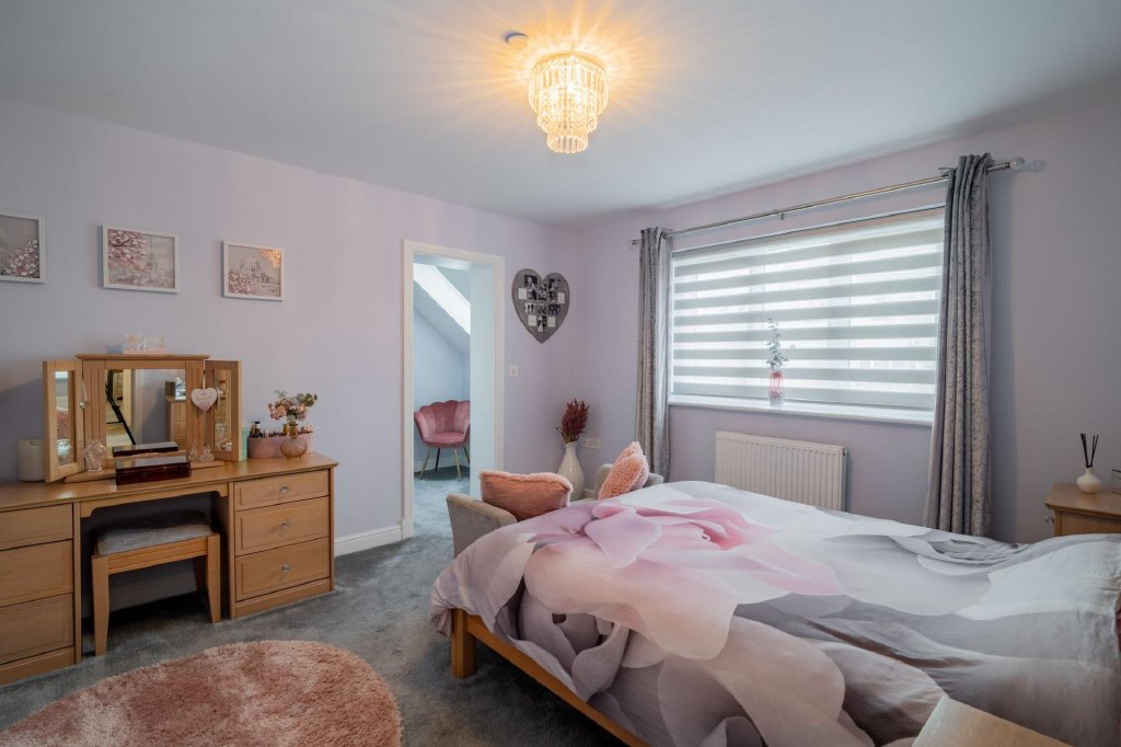 A beautiful wooden staircase leads to the upper floors, where four generous bedrooms can be found on the first floor. The main bedroom is particularly impressive, featuring a dressing room and a luxurious en-suite finished to a high standard. Bedroom two also benefits from a spacious, beautifully tiled en-suite. A large family bathroom serves the remaining rooms, while bedrooms three and four are both well-proportioned, tastefully decorated, and ideal for family or guests.