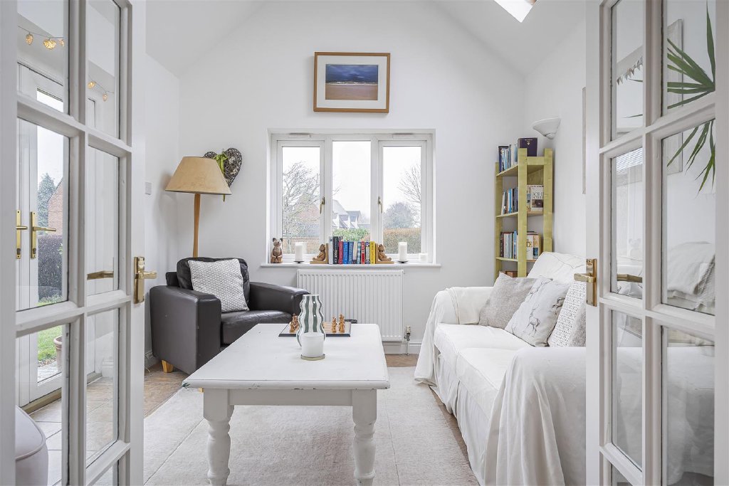 An attractive garden room, accessed from the living room, lends itself to enjoying long summer evenings. With a vaulted ceiling and French doors to the garden, it's filled with natural light, and makes it a fabulous addition to this delightful village home.