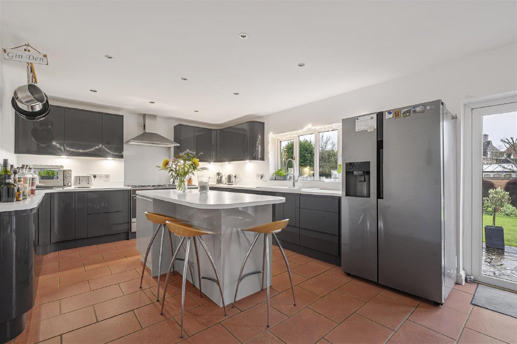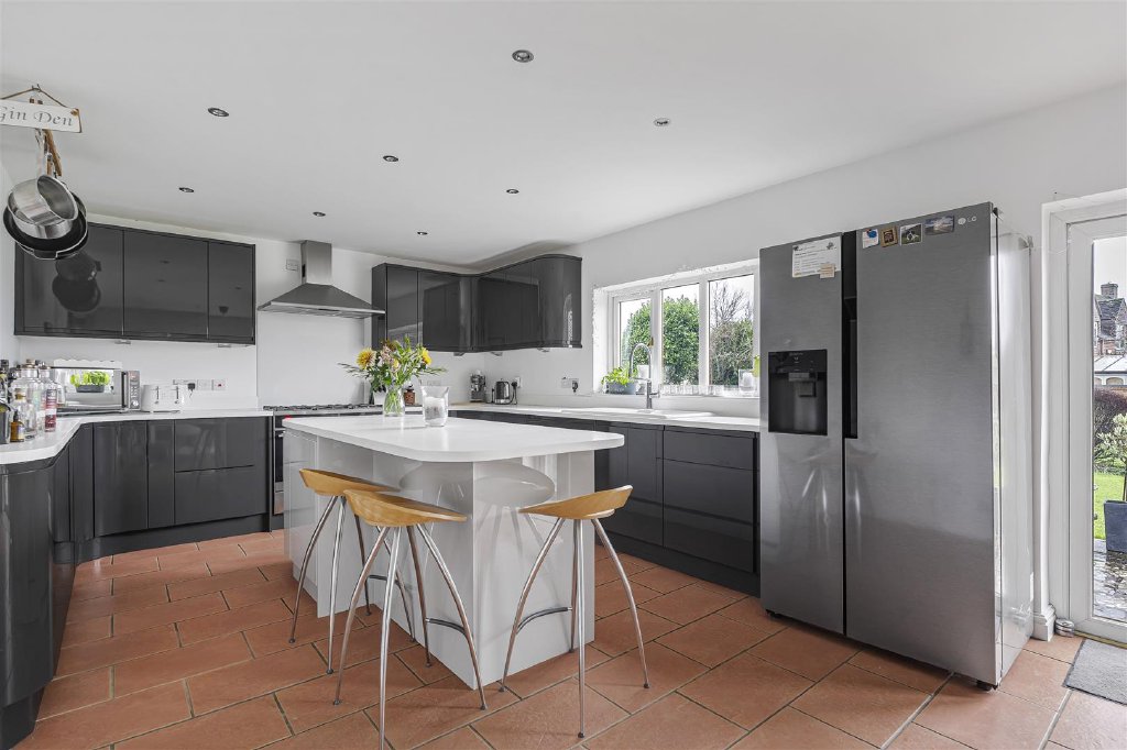 A light and spacious entrance hallway welcomes you, and leads through to the kitchen/breakfast room, which has been refitted with a generous number of contemporary floor and eye-level units, an island, integrated appliances, complemented by Corian worksurfaces, and space for a large American-style fridge/freezer.