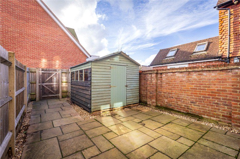 The rear garden is a private, paved courtyard framed by attractive brick walls and mature climbing plants, providing a tranquil setting for outdoor dining or simply enjoying the fresh air. To the front, there is a neat gravelled area and gated access, whilst the driveway and parking are to the rear of the property.