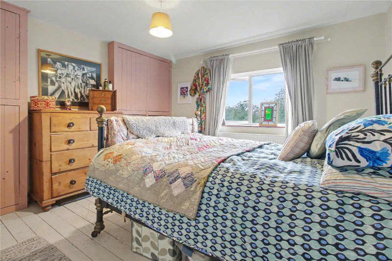 The ground floor also offers a versatile sitting room which could equally serve as a fourth bedroom if required, providing excellent flexibility for growing families or those needing home-working space. These rooms are served by a well-appointed bathroom fitted with a white suite, including a shower cubicle, wash hand basin and close-coupled WC. A turning staircase rises to the first floor, where a spacious landing leads to three well-proportioned bedrooms. Two of these enjoy attractive views across the rear garden reinforcing the home’s semi-rural feel.