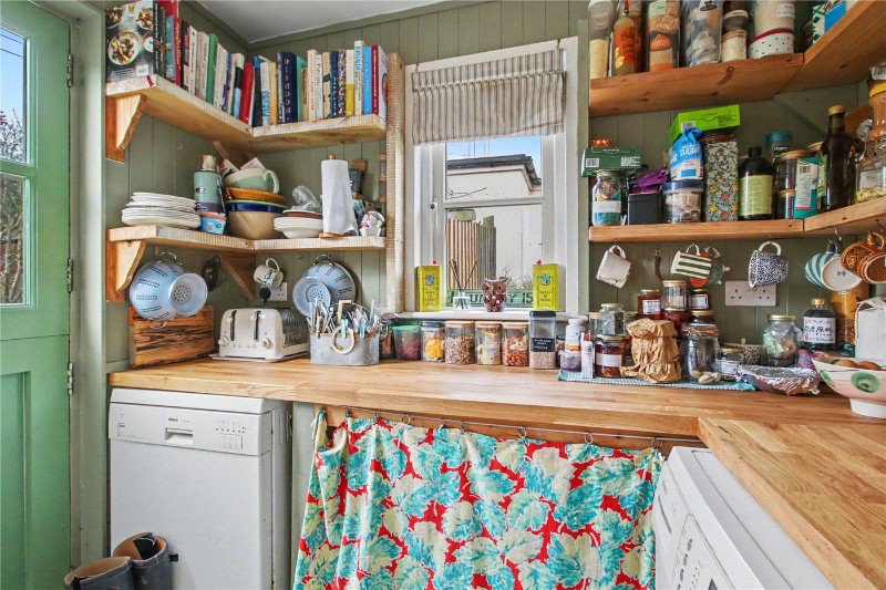 - Fitted kitchen with timber work surfaces and space for a range cooker