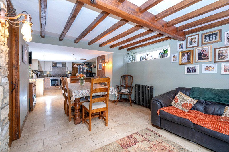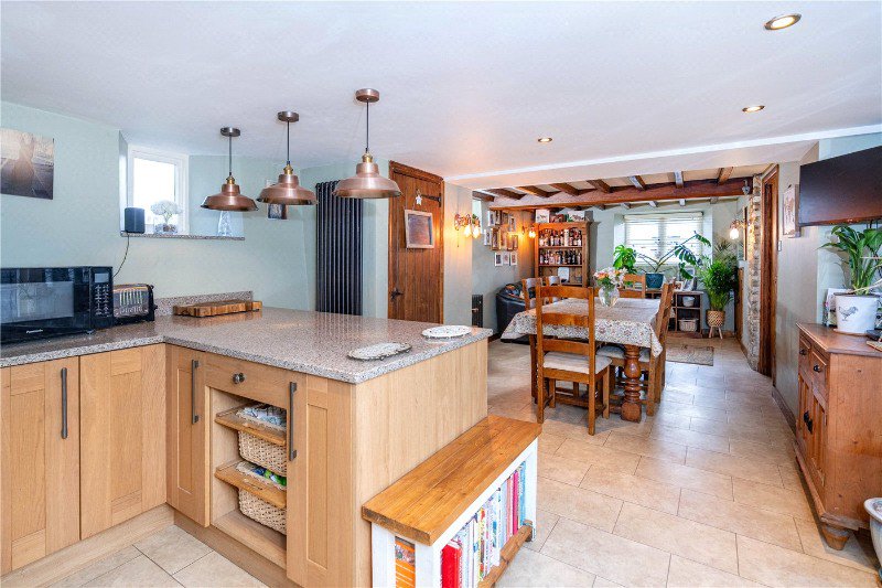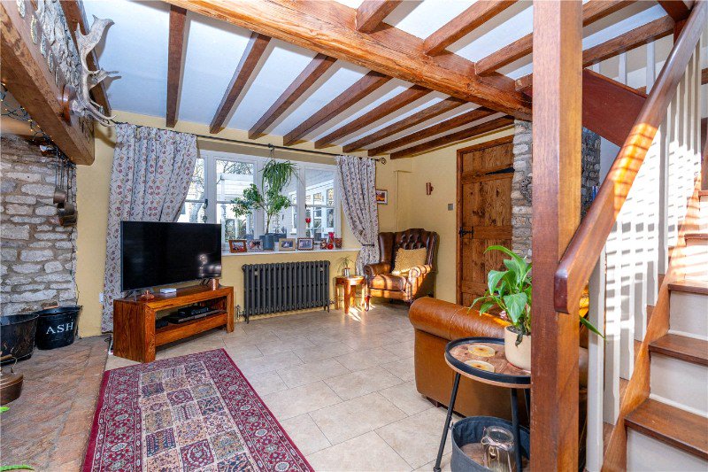 As you step down into this characterful home there is so much to take in, with window to the front aspect, natural light illuminates the whitewashed timber beams, exposed stonework, school master radiator, bespoke coats cupboard and finished with Amtico flooring.