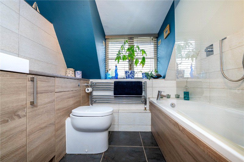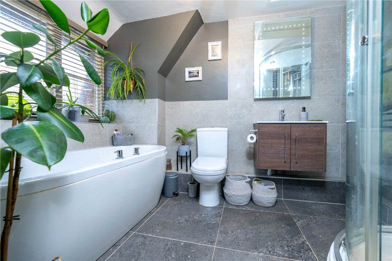 With frosted window to the rear aspect, comprising a quality four-piece suite, low level WV, wash hand basin set in vanity unit, curved panel bath and corner shower cubicle with rain shower over, heated towel rail, loft access, tiled splash backs and extractor fan.