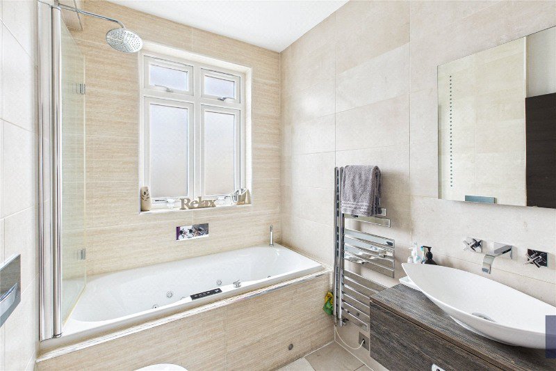 Upstairs, the property offers four well-proportioned bedrooms arranged over two floors, including an impressive top-floor suite with air conditioning, eaves storage, and a luxury bathroom featuring underfloor heating, high-end finishes, and a premium shower system. The remaining bedrooms are served by excellent bathroom facilities, including a jacuzzi bath and rainfall shower systems, giving the home a true “turn-key” feel.