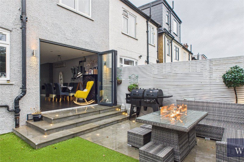 The ground floor is the heart of the home, designed for modern family living and entertaining, with a bright and spacious open-plan kitchen/living area. The kitchen is fitted with sleek cabinetry, quality integrated appliances, and clever additions such as a boiling water tap and integrated waste disposal, while skylights and large rear glazing flood the space with natural light. There is a seamless flow out to the landscaped rear garden, which has been designed to be low-maintenance and high impact, with integrated lighting, external power points, and a smart, social layout ideal for summer gatherings.