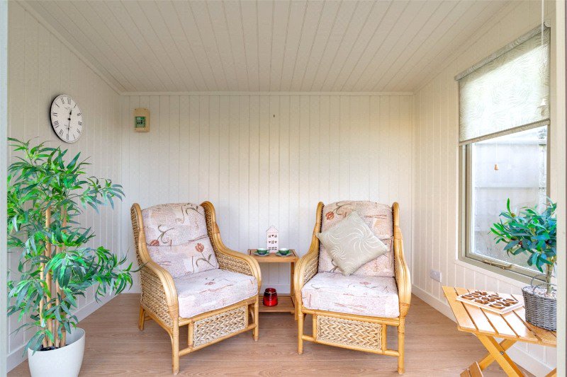 The integral double length garage has an up-and-over door, lighting, power points, an airing cupboard housing a Worcester gas central heating boiler, a water tap, and a door to the rear garden. There is also access at the side of the house to the nicely enclosed, neatly maintained rear garden, which features a lawn, a patio, well stocked borders, a timber shed (with power) and a large timber summerhouse/studio (with power).