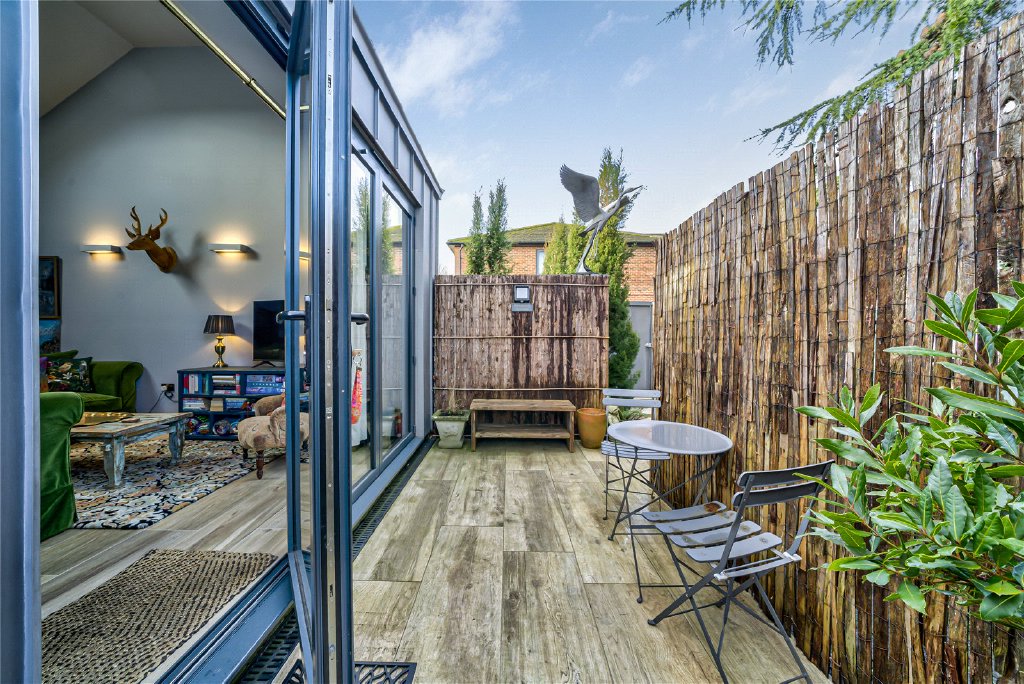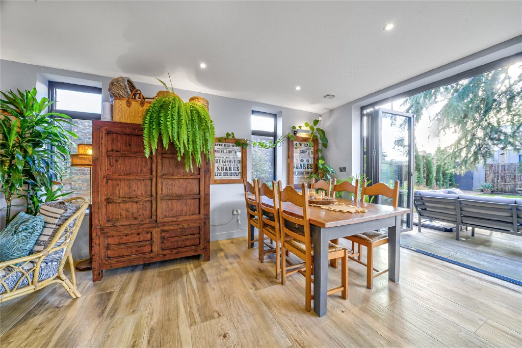 Expansive ceramic flooring with underfloor heating flows seamlessly throughout the ground floor and extends out onto the terrace via impressive multi-panel bi-fold doors, allowing indoor and outdoor living to merge effortlessly and flooding the space with natural light.