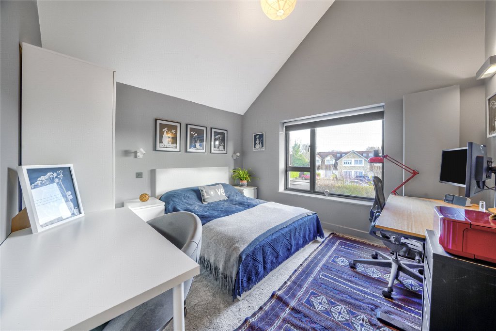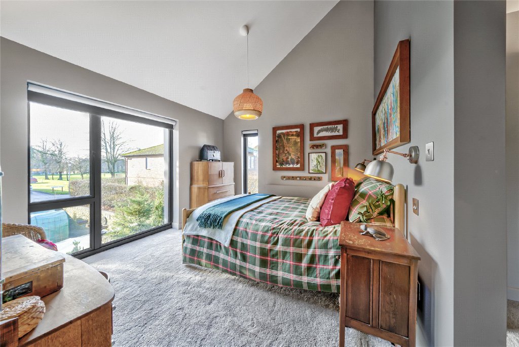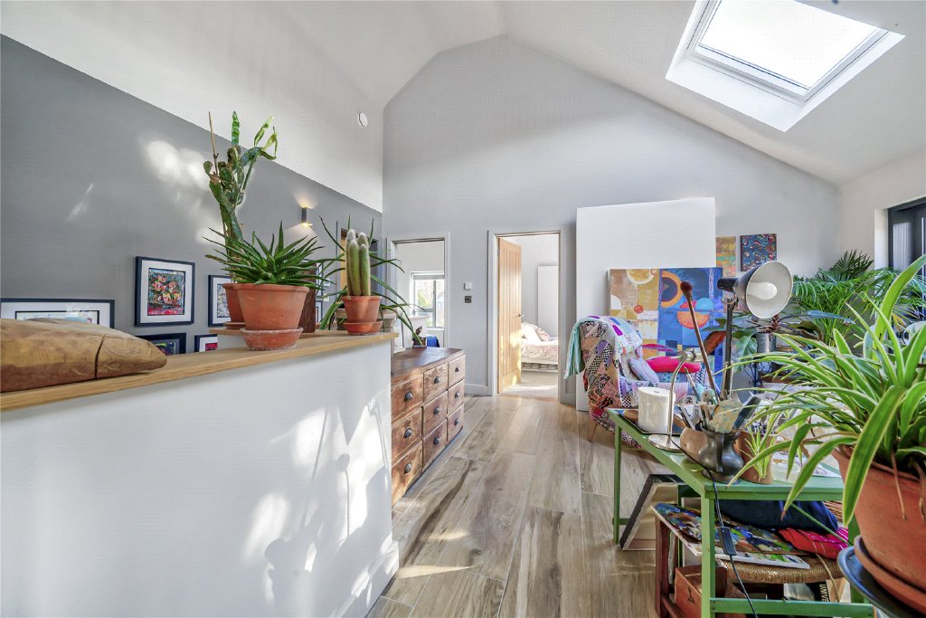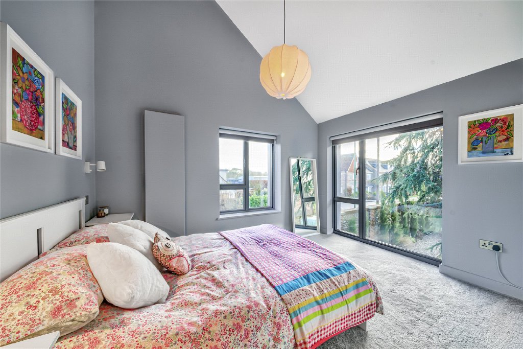 The first floor continues the home’s architectural narrative, where vaulted ceilings introduce a wonderful sense of volume and refined elegance. At its centre, the striking double-height landing is bathed in natural light and opens onto a Juliet balcony, creating an adaptable space ideal for a reading area, study nook or quiet retreat, with elevated views across the garden and towards Roussillon Park beyond.