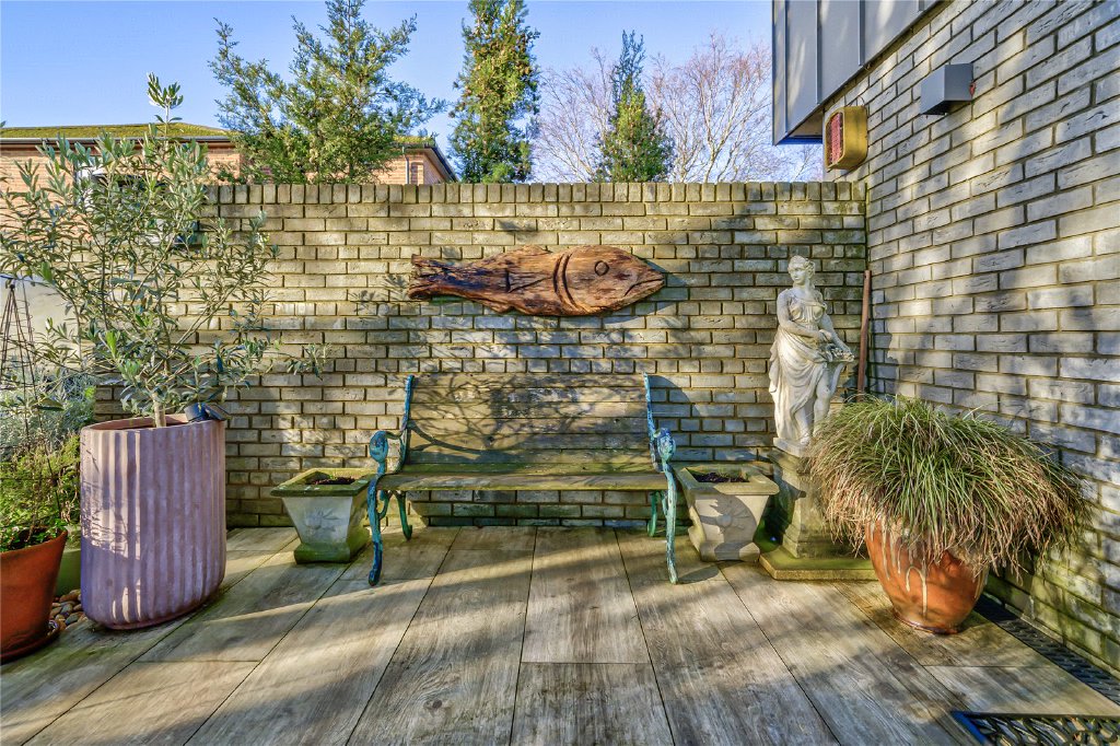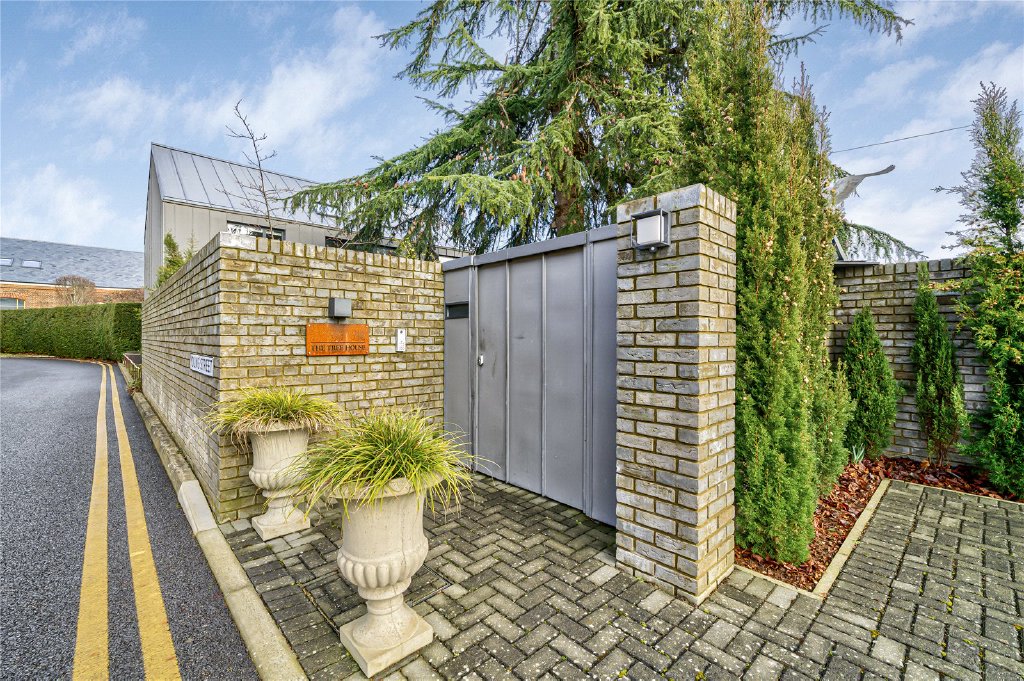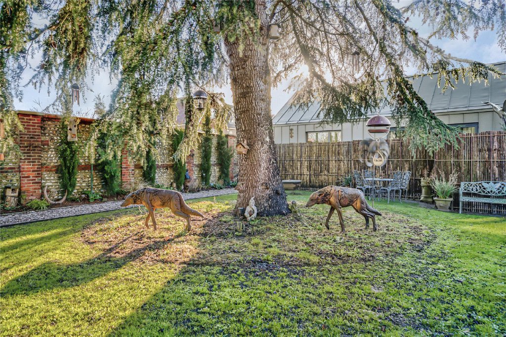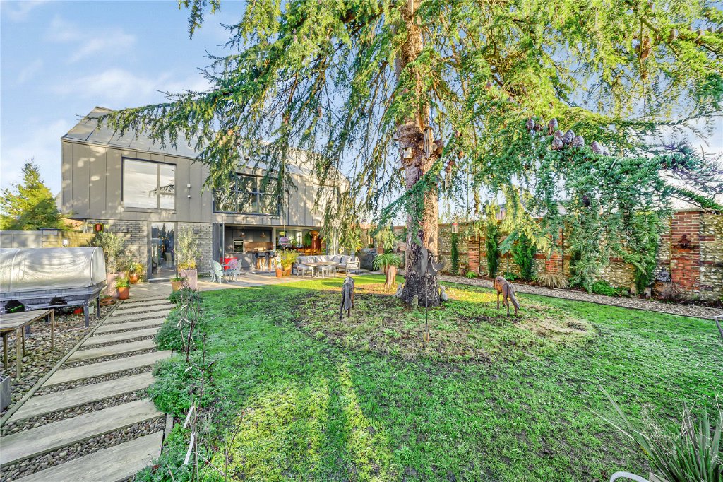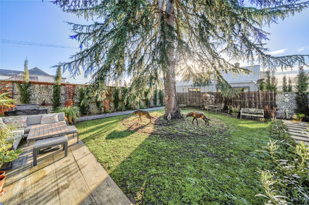 The private, walled garden has been thoughtfully landscaped to create an elegant yet low-maintenance outdoor environment. Feature external lighting enhances the ambience, while a pathway leads from the entertaining terrace across manicured lawns and borders to the annexe, framed by the mature tree that gives the property its name.