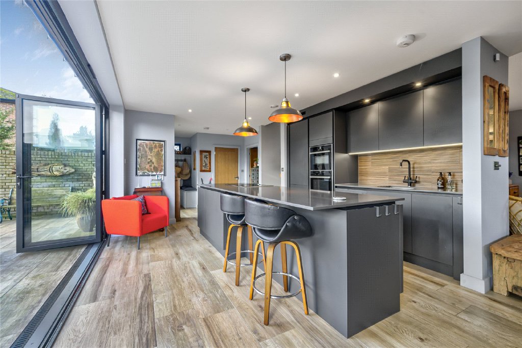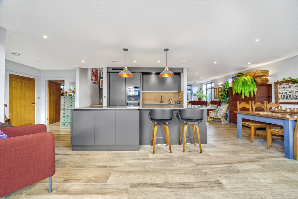 - Striking open plan kitchen, dining and living space with large island and integrated appliances
