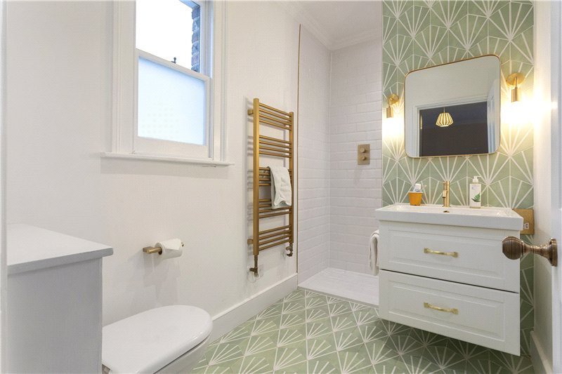 On the first floor, the principal bedroom suite is positioned at the front of the house, overlooking Slade Gardens. The bedroom is generously proportioned and offers ample built-in storage. Adjacent is a beautifully appointed en suite bathroom featuring wall panelling, a walk-in shower, a separate roll-top bath, heated towel rail, basin and W.C. To the rear is the second bedroom, tastefully decorated and retaining its original Victorian cast-iron fireplace.