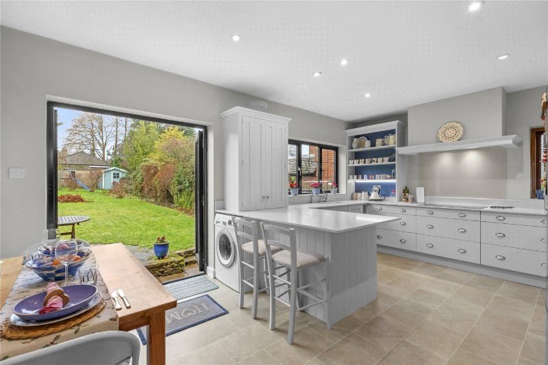The stunning kitchen/breakfast room forms the heart of the home and has been beautifully designed with contemporary living in mind. Fitted with neutral base and wall units topped with quartz work surfaces, the space is centred around a peninsula breakfast bar. Integrated appliances include a dishwasher, a five-ring Neff induction hob with extractor, double eye-level ovens, and space for a large fridge/freezer. French doors lead out to the garden, making this an ideal space for entertaining.