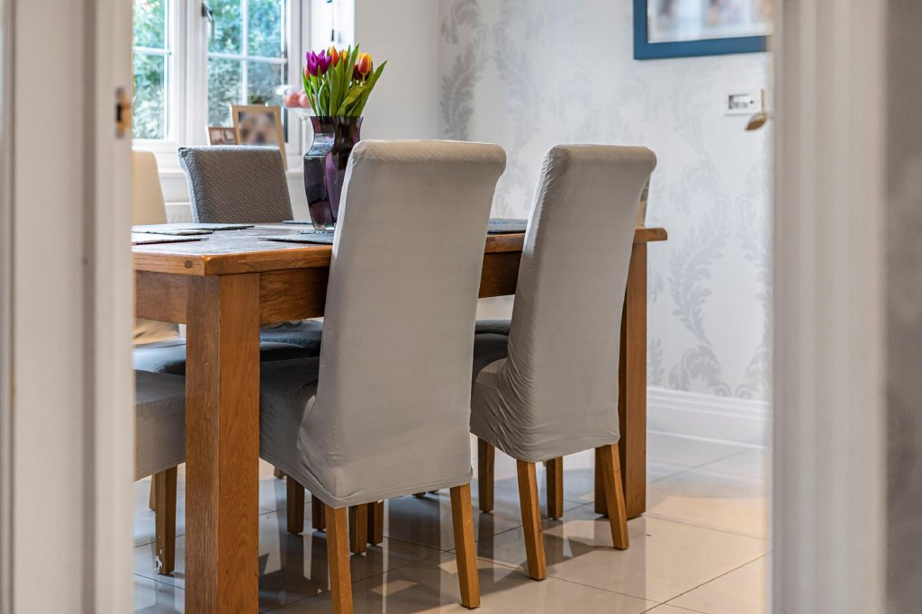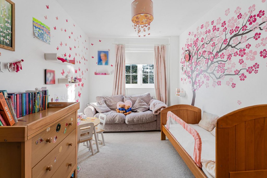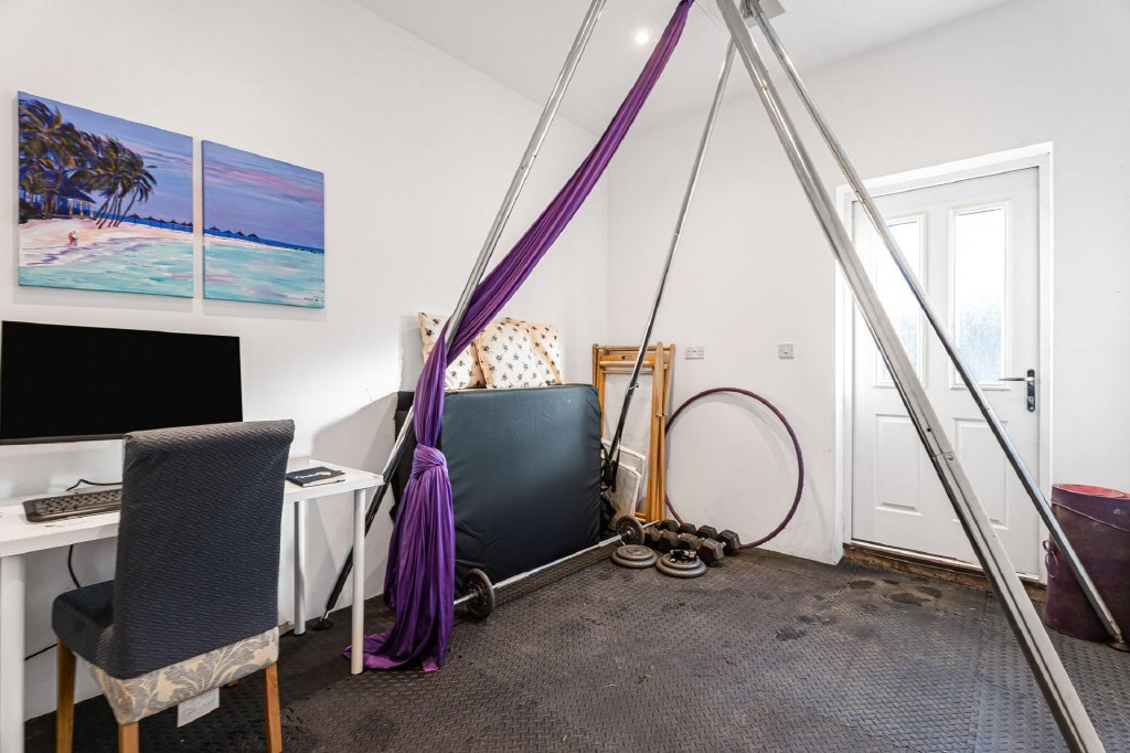 The ground floor is thoughtfully designed for modern living, featuring a spacious and light-filled living room with French doors opening onto the south-east facing garden, ideal for both entertaining and everyday family life. The contemporary kitchen/dining room offers excellent storage, quality integrated appliances, and generous space for dining, while a converted garage currently provides a useful home gym or an office.
