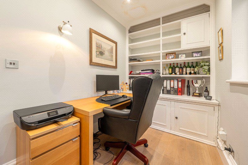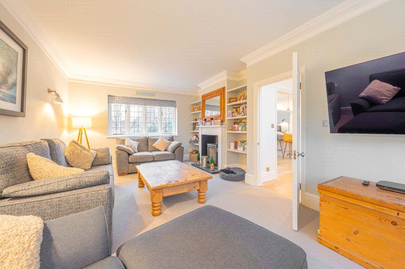 The drawing room is a particularly impressive reception space, featuring a bay window, fireplace, Contura log burner and bespoke alcove shelving, creating a warm yet refined setting for everyday living and entertaining.
