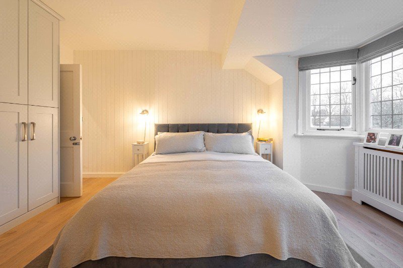 The principal bedroom suite is a generous and elegant space, benefitting from bespoke fitted wardrobes and a newly renovated en-suite bathroom featuring a freestanding bath, walk-in shower and Porcelanosa fittings.
