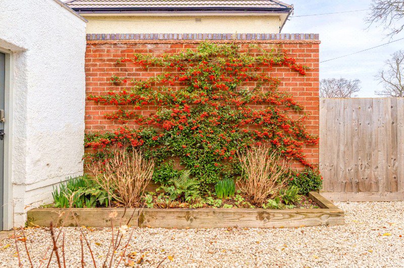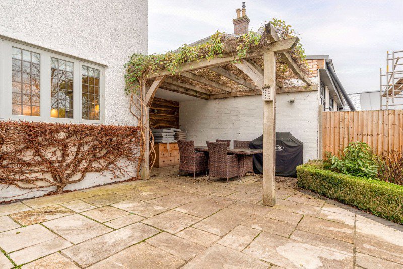 Several thoughtfully positioned seating areas are dotted throughout, including an established pergola offering sheltered outdoor space. The garden is richly planted with a variety of mature trees, including apple, acer, eucalyptus, cherry blossom, fig and Indian bean, creating year-round interest and a strong sense of seclusion. A discreet log store is tucked away, and there is convenient access to the attached garage.