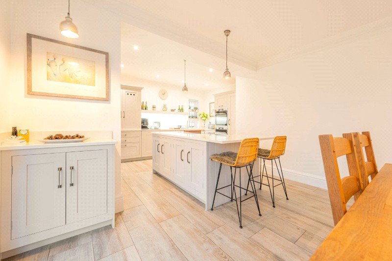 At the heart of the home is the generous open-plan kitchen, breakfast and family room, thoughtfully designed for modern living. The bespoke Harvey Jones kitchen is centred around a substantial island with breakfast bar, complemented by white granite worktops and Mandarin Stone tiled flooring. A useful larder cupboard provides additional storage, while integrated appliances include two AEG ovens, an Elica Nikola Tesla induction hob with integrated extractor, a Miele dishwasher and a fridge. This space flows naturally into the family seating area, creating a superb hub for day-to-day life.
