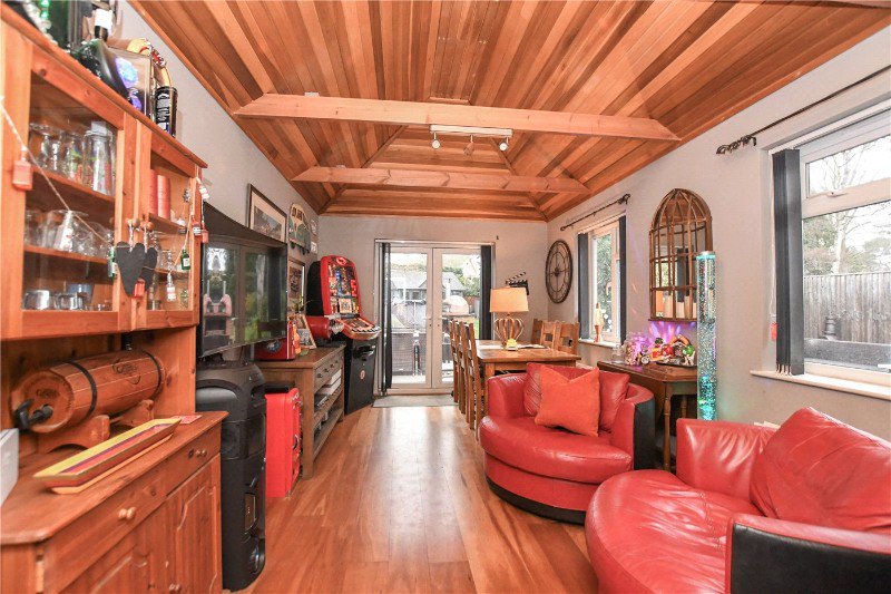 Externally, the rear garden is a particular highlight, providing excellent space for children and outdoor entertaining. The outbuilding/summer house, currently arranged as a cinema room, offers a range of potential uses including a home office, hobby room or additional entertaining space. To the front, the property benefits from ample off-road parking along with a garage.
