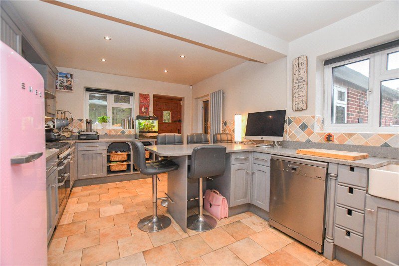 The ground floor opens into a welcoming entrance hall, leading through to a bright and spacious living room featuring a bay window. This space flows through to a separate dining room, divided by a character log burner and extending into a conservatory that enjoys pleasant views over the garden. The contemporary kitchen/breakfast room is well arranged with ample storage, generous worktop space and a breakfast bar, making it both practical and sociable. A further reception room adds flexibility and would suit use as a family room, home office or playroom. Completing the ground floor is a utility room and cloakroom, created as part of a garage conversion.