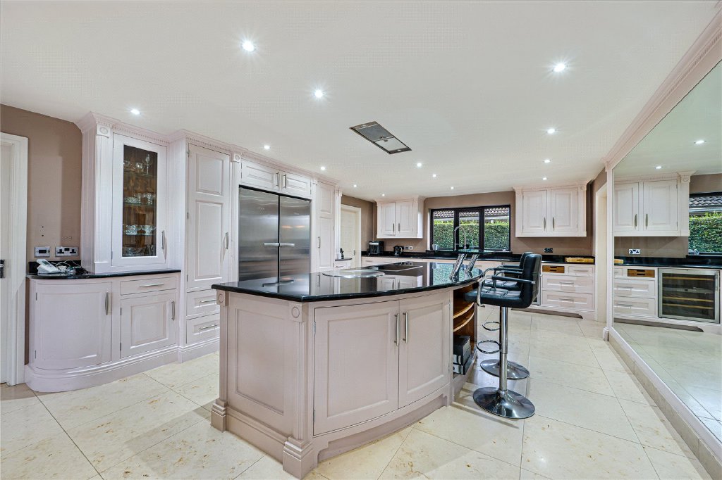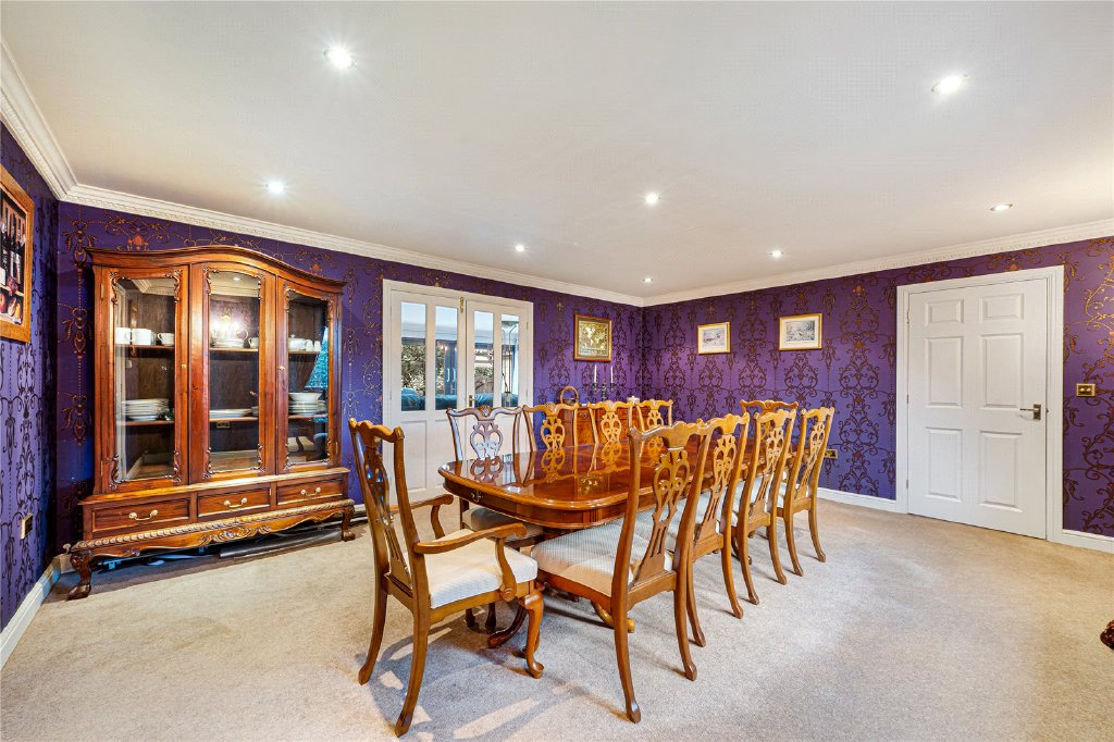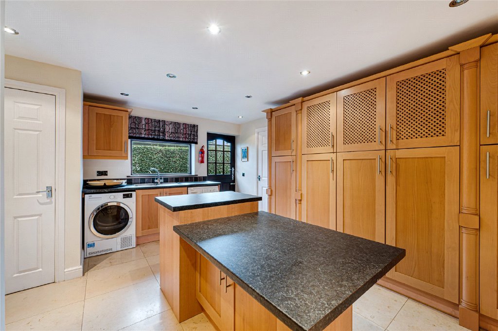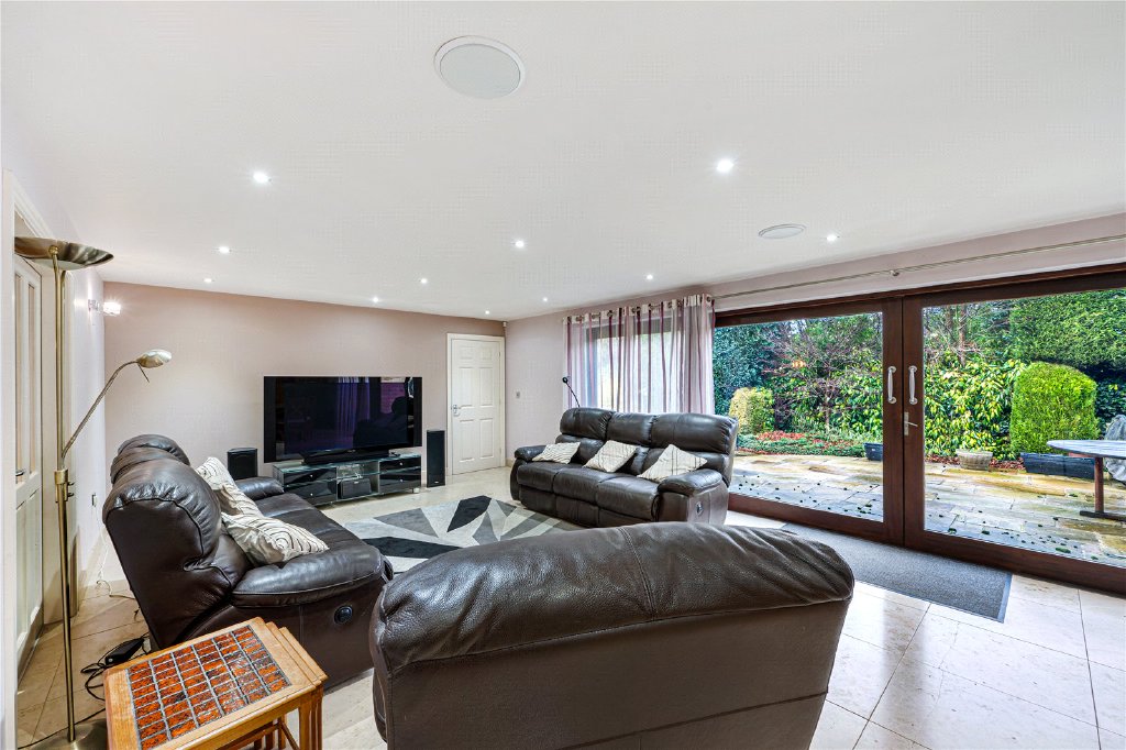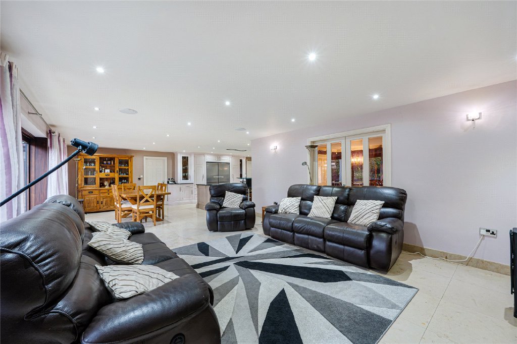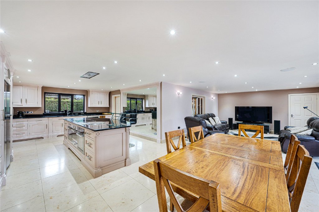 The property is entered via a large and impressive entrance hall, setting the tone for the quality and scale found throughout. To the ground floor are two well-proportioned bedrooms, with one having its own en-suite bathroom, featuring both a bath and separate shower. Plus a versatile study which could be used as a home office, playroom or snug. A utility room provides ample fitted storage, sink, and plumbing for both washing machine and dryer, with direct access to the integral garage, and a guest W.C. To the rear of the home lies the heart of the property – a stunning open-plan kitchen, dining and snug living area, designed perfectly for modern family life and entertaining. The contemporary kitchen is fitted with high-quality units, black granite work surfaces, integrated appliances, a central island, underfloor heating, and space for a freestanding American-style fridge/freezer. This flows seamlessly into a generous dining and snug seating area, with patio doors opening onto the garden, creating a wonderful indoor-outdoor connection. In addition, there is a formal dining room with double doors leading through to the main lounge. The lounge is an inviting and elegant space, featuring a stone-built fireplace with wood-burning stove and French doors opening onto the garden patio.