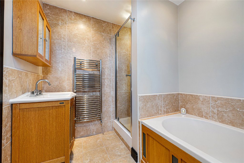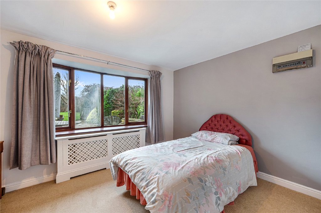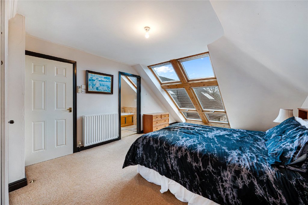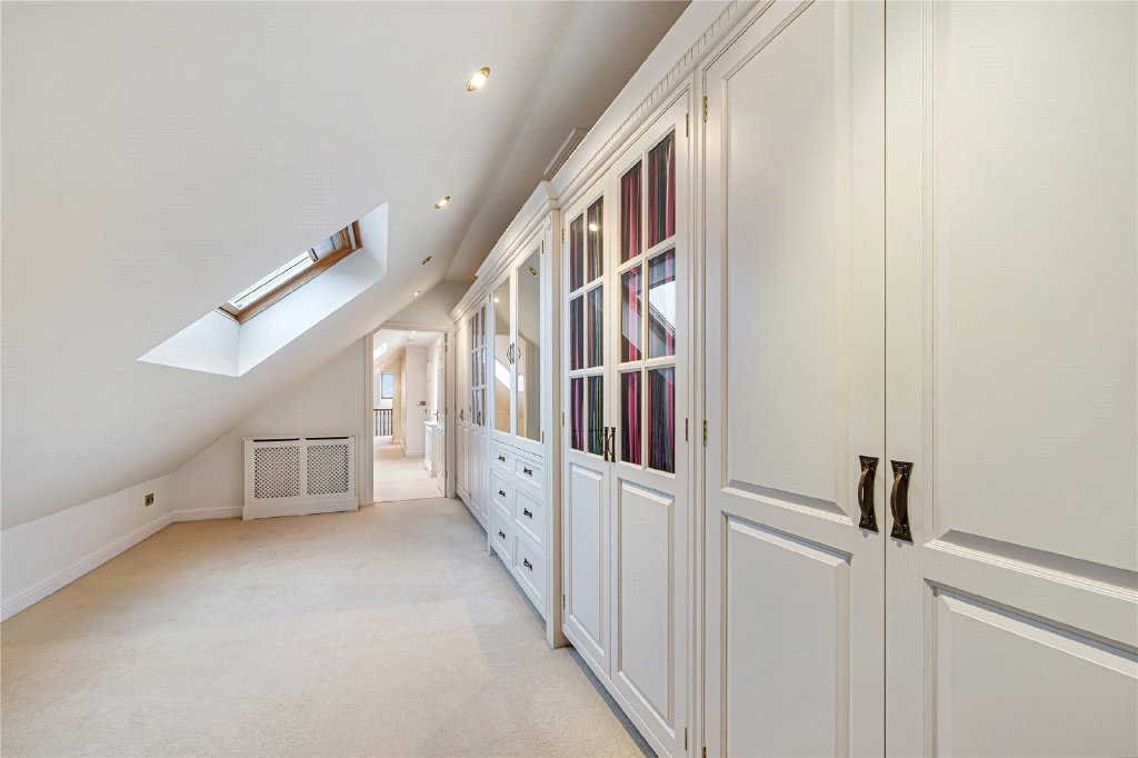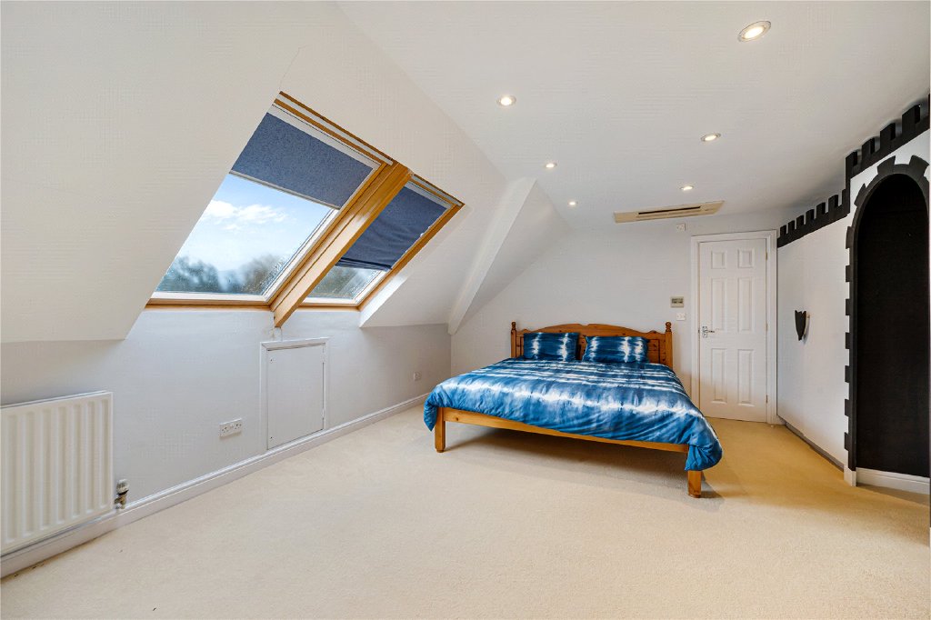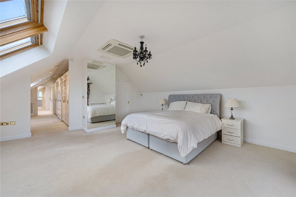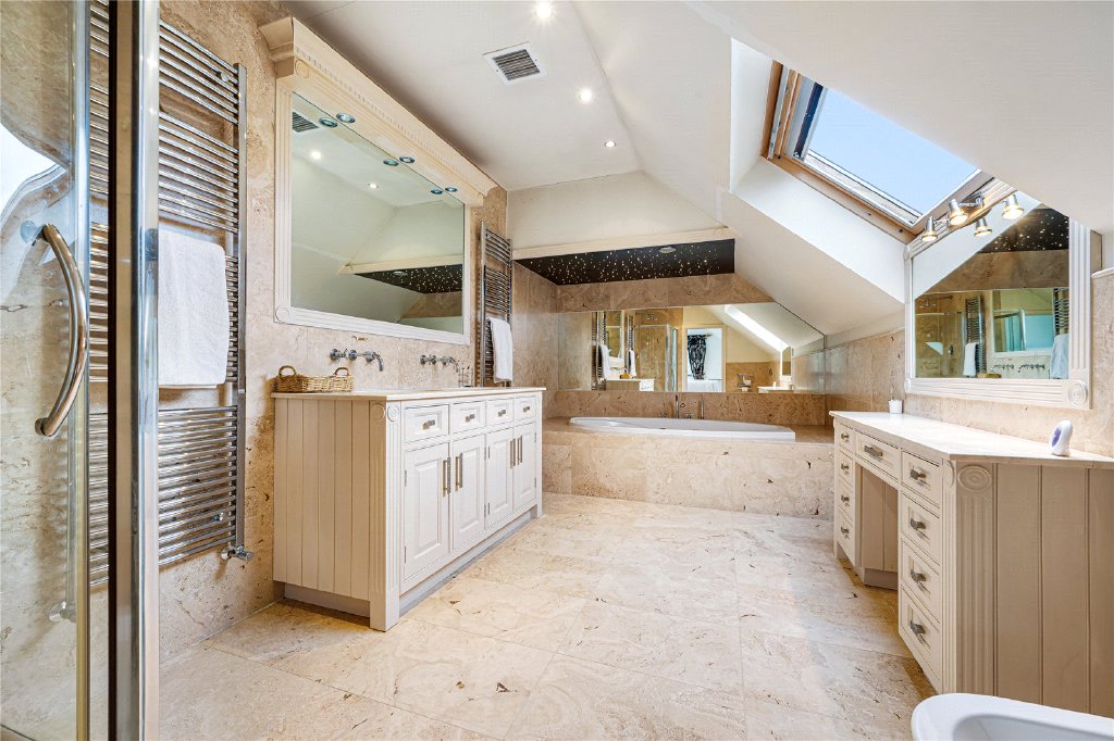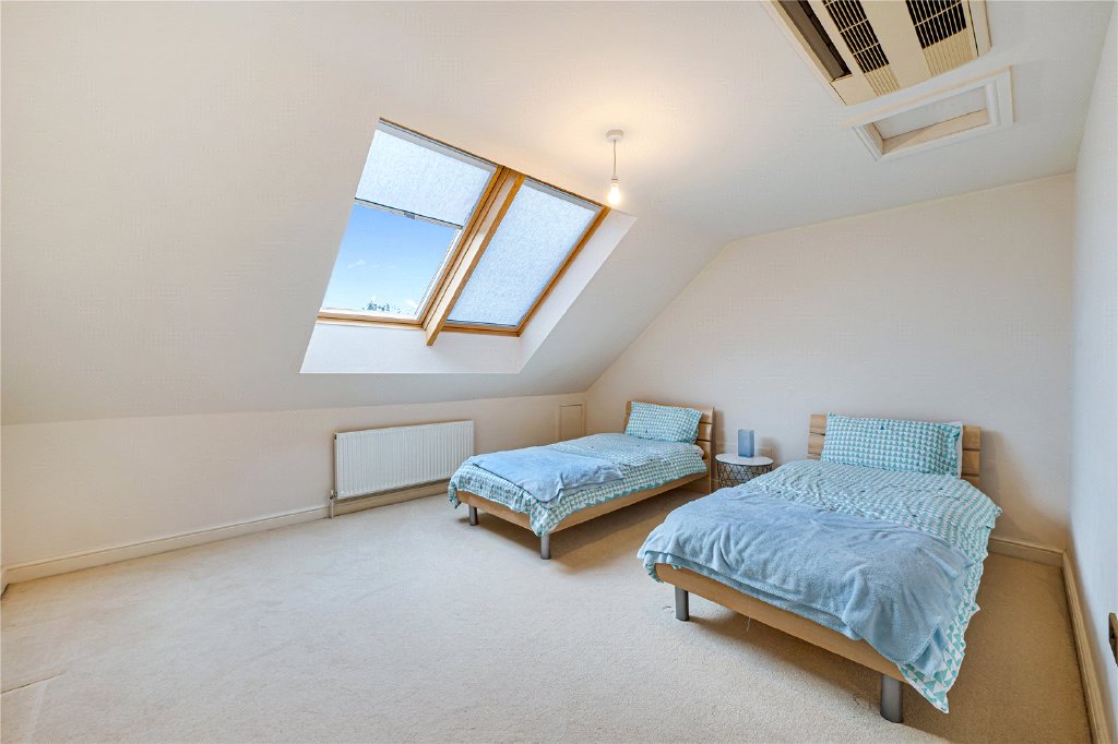 The first floor continues to impress. The principal bedroom suite, located at the rear, enjoys a private balcony overlooking the stunning garden, along with a dressing room and a luxurious en-suite bathroom. There are two further double bedrooms, both benefitting from Velux windows and fitted air conditioning, sharing a stylish Jack and Jill shower room. To the front of the property is an additional guest bedroom with its own en-suite bathroom, providing excellent accommodation for visitors or older children.