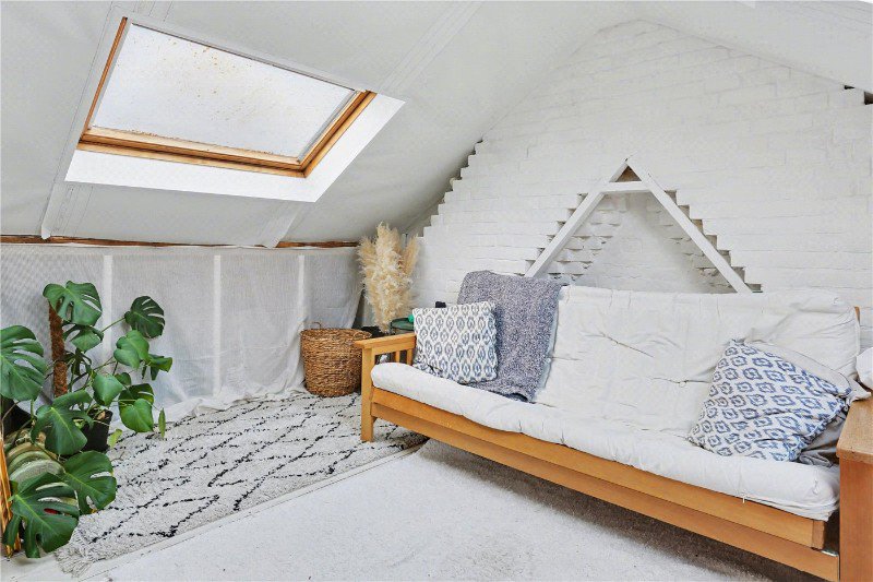 Upstairs, three bedrooms are arranged off the landing, offering a more traditional and convenient configuration. The principal bedroom is particularly impressive, filled with natural light thanks to its opened-up ceiling, exposed beams and a large, remotely operated Velux window with automatic rain sensor. A pull-down ladder from the landing provides access to the loft space, which benefits from two Velux windows, creating a bright and versatile area suitable for storage or alternative uses, subject to requirements.