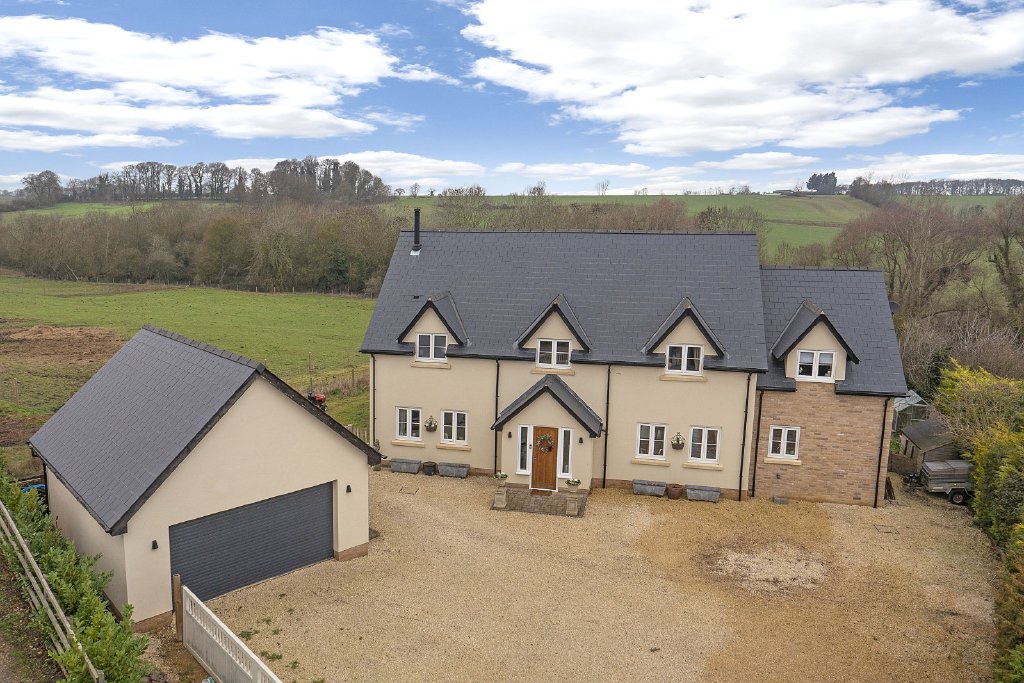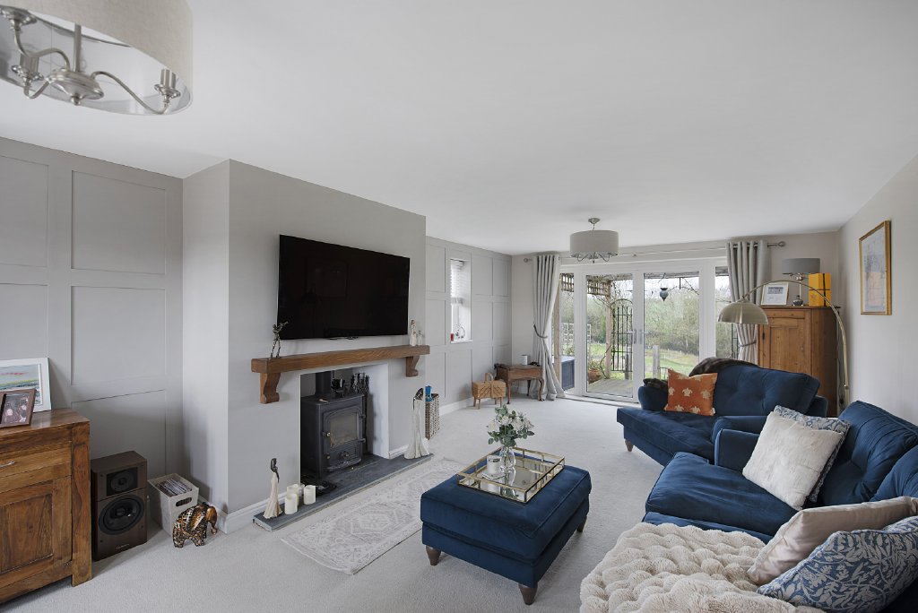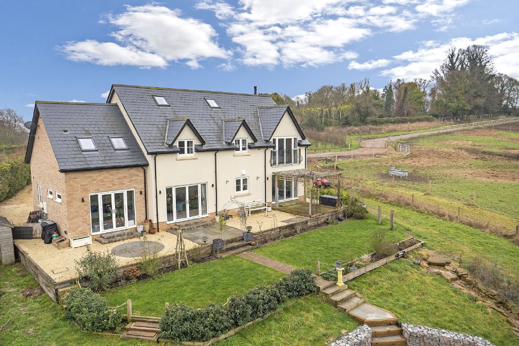 Set within grounds of over half an acre, the landscaped rear garden is a particular highlight, enjoying far-reaching views across open countryside. Designed to offer both privacy and tranquillity, the garden features a sunken terrace ideal for outdoor dining and relaxation, with mature planting creating a natural and inviting backdrop. To the front, there is ample off-road parking for several vehicles, together with access to a detached double garage.