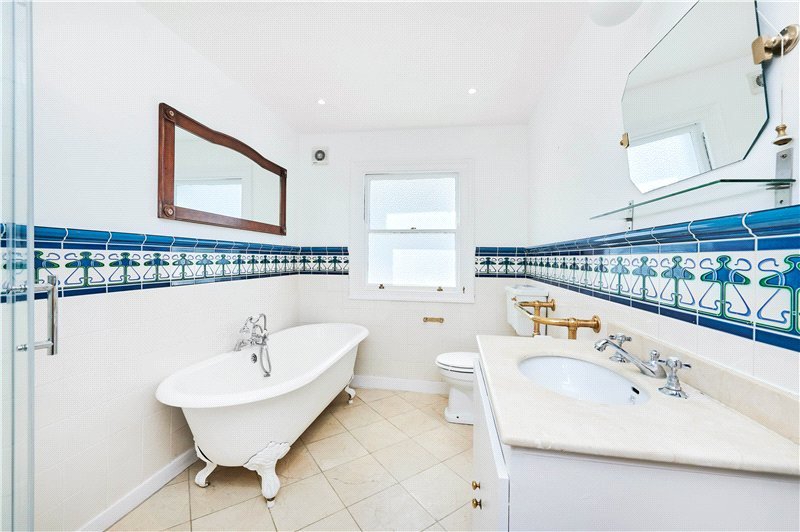 The family bathroom features bespoke handmade tiles, a freestanding cast iron bath, and a separate walk-in shower.