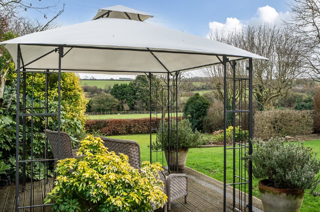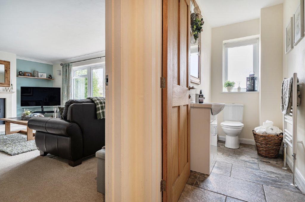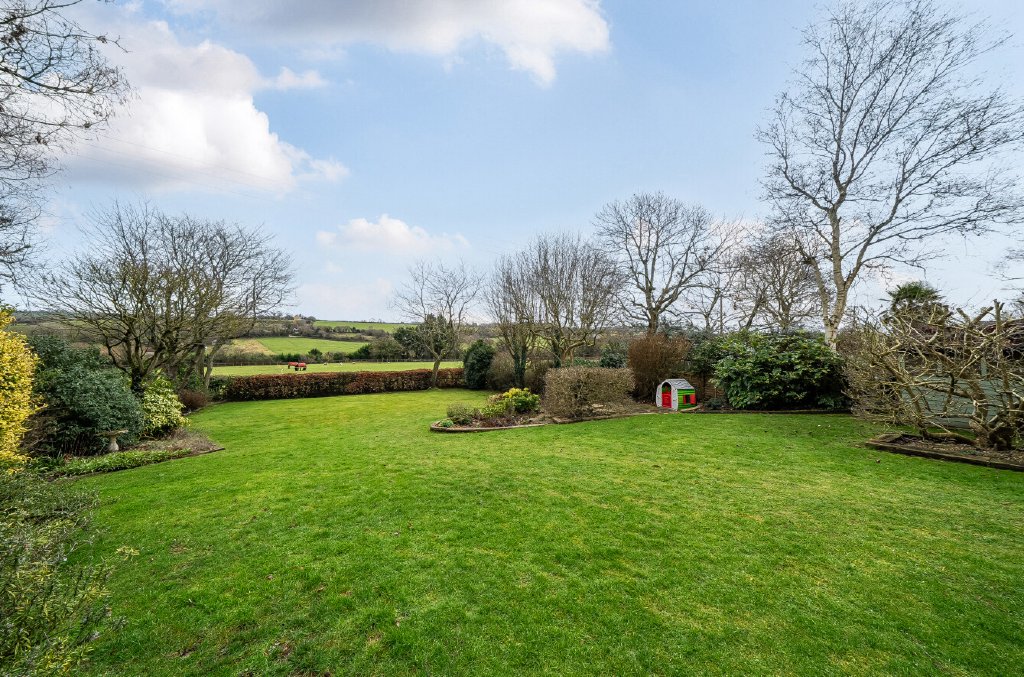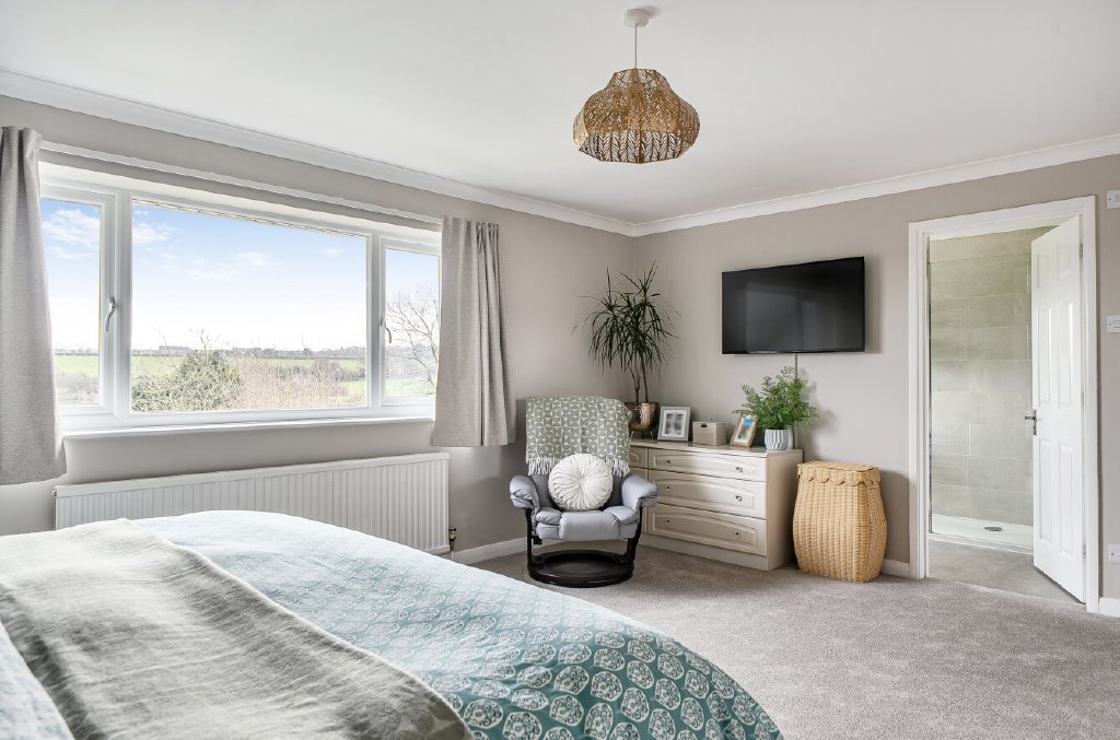 Outside, a large, gated driveway and double garage with electric doors provide ample parking for multiple vehicles, while the sweeping rear lawn, bordered by mature trees – including three spectacular magnolias – and established planting, draws the eye towards truly beautiful countryside views. They say, ‘south-east facing, we’ve never grown tired of the outlook in all the years we’ve lived here – it’s something we quickly fell in love with and have enjoyed throughout the seasons.’