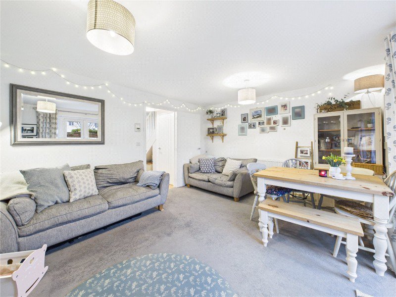 The ground floor comprises a welcoming entrance hallway with stairs rising to the first floor and access to a convenient cloakroom/WC. To the front is a modern, well-proportioned kitchen fitted with a range of units and work surfaces, while to the rear sits a generous living room, flooded with natural light and featuring double doors opening directly onto the rear garden—ideal for both everyday living and entertaining.