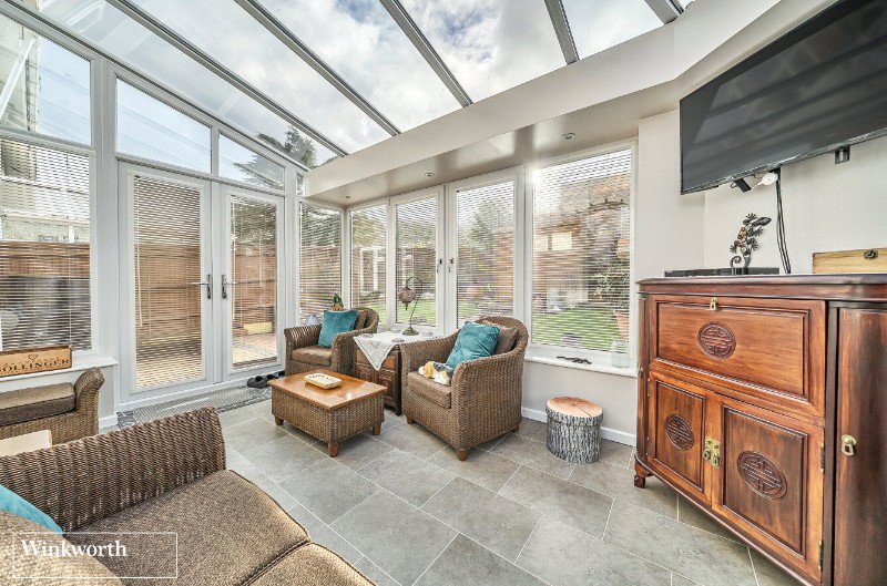 The large living room is to the rear of the house. There are double doors off the inner hallway into the spacious wrap around conservatory – currently used as a garden sitting room and exercise zone.