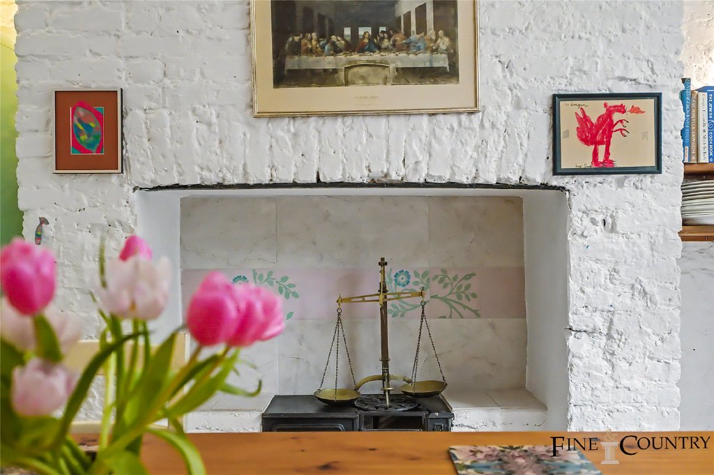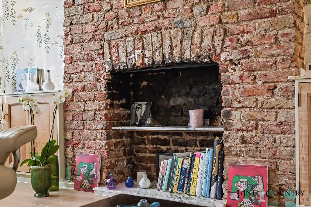 Beyond, the space flows naturally into the dining area, where an original working Victorian stove forms a striking focal point. Set within an exposed brick fireplace wall and framed by marble detailing, it adds both visual interest and practical charm, anchoring the room as a natural gathering space. The dining area connects seamlessly with the kitchen, creating a sociable open-plan arrangement without sacrificing definition between zones.