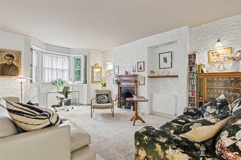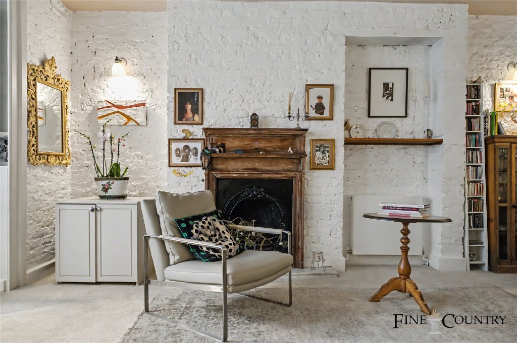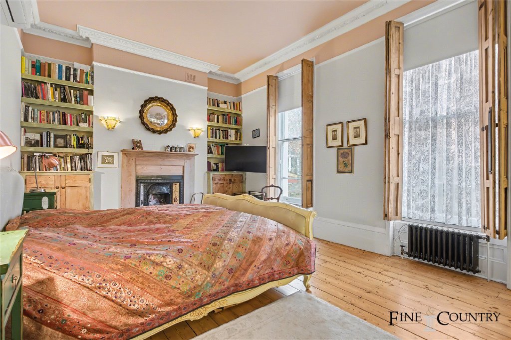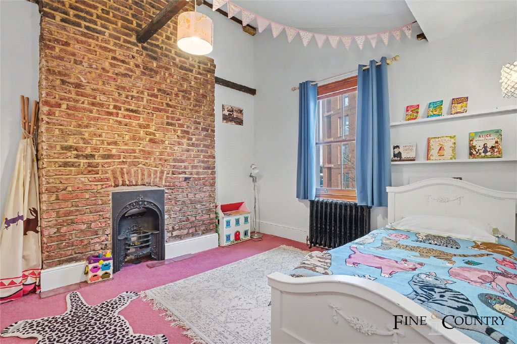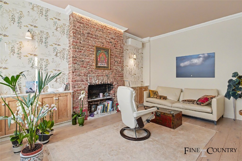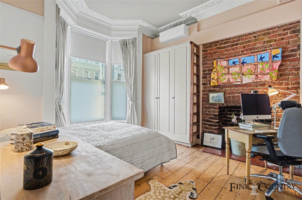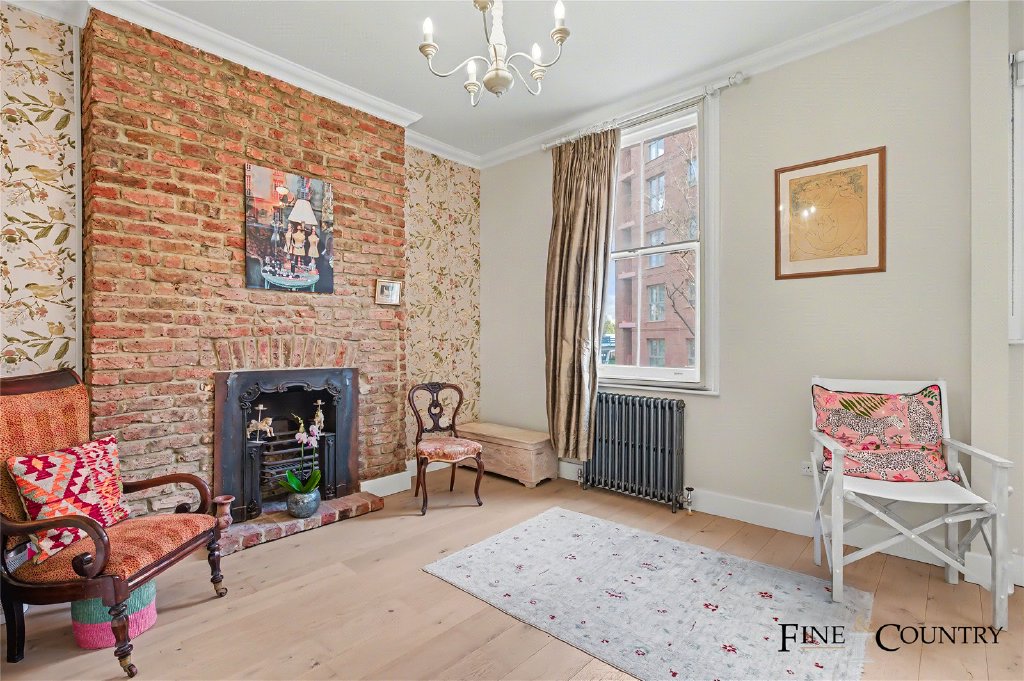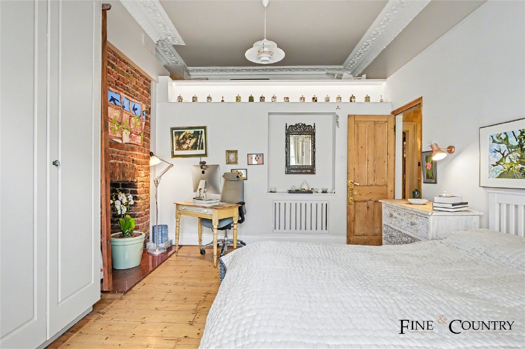 The ground floor forms a more formal and private layer of accommodation, well suited to principal living or bedroom use. To the front of the house, a generously proportioned room enjoys excellent natural light through tall sash windows. The room retains strong period character, with detailed cornicing, timber flooring and a Victorian fireplace set within an exposed brick chimney breast, combining architectural presence with a warm, lived-in feel.