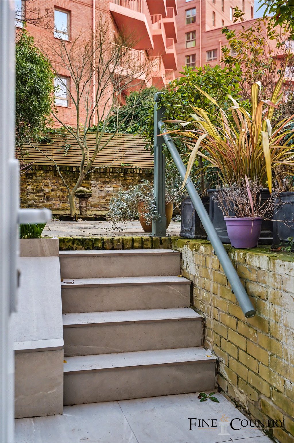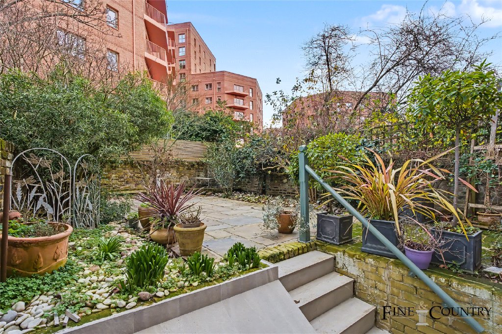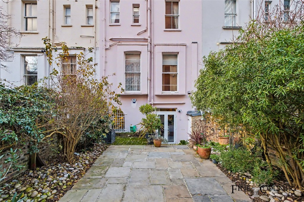 The rear garden is a secluded and tranquil outdoor space, landscaped and recently re-laid using original York stone paving. Steps lead up from the lower ground floor to a generous patio area, ideal for outdoor dining, before giving way to a further paved section framed by mature planting and established greenery. The thoughtful design offers flexible zones for entertaining, relaxation, and planting.