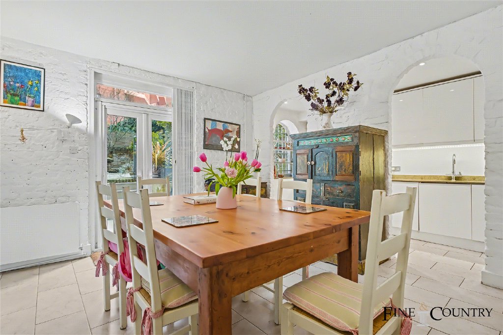 Full height glazed doors open directly from the dining area onto the garden, drawing in natural light and creating a strong visual connection between interior and exterior. This level also benefits from an additional shower room, enhancing its versatility for guests or extended family use.