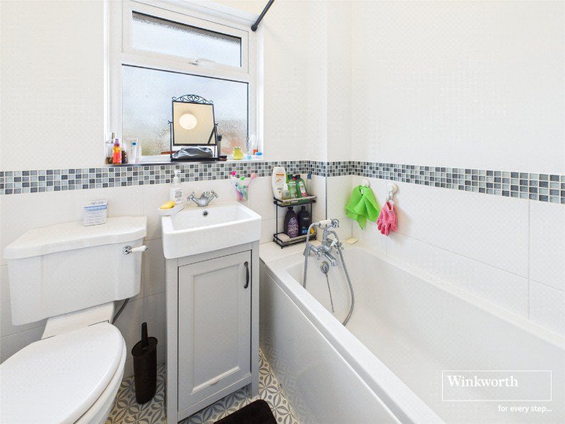 The bathroom is positioned off the landing and is neatly arranged with a bath, WC, and wash basin, making good use of the available space.
