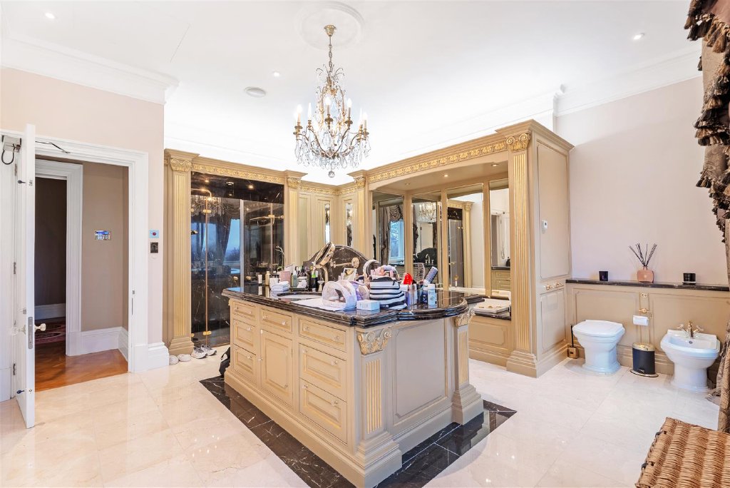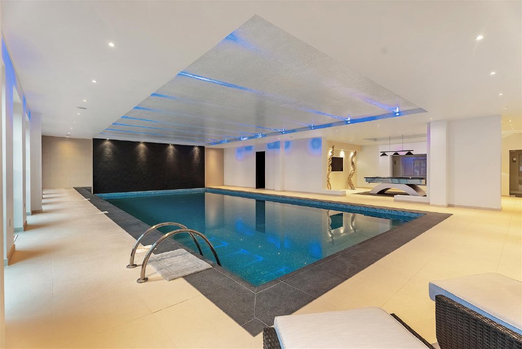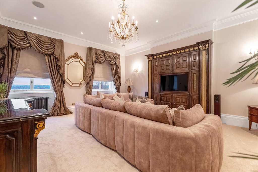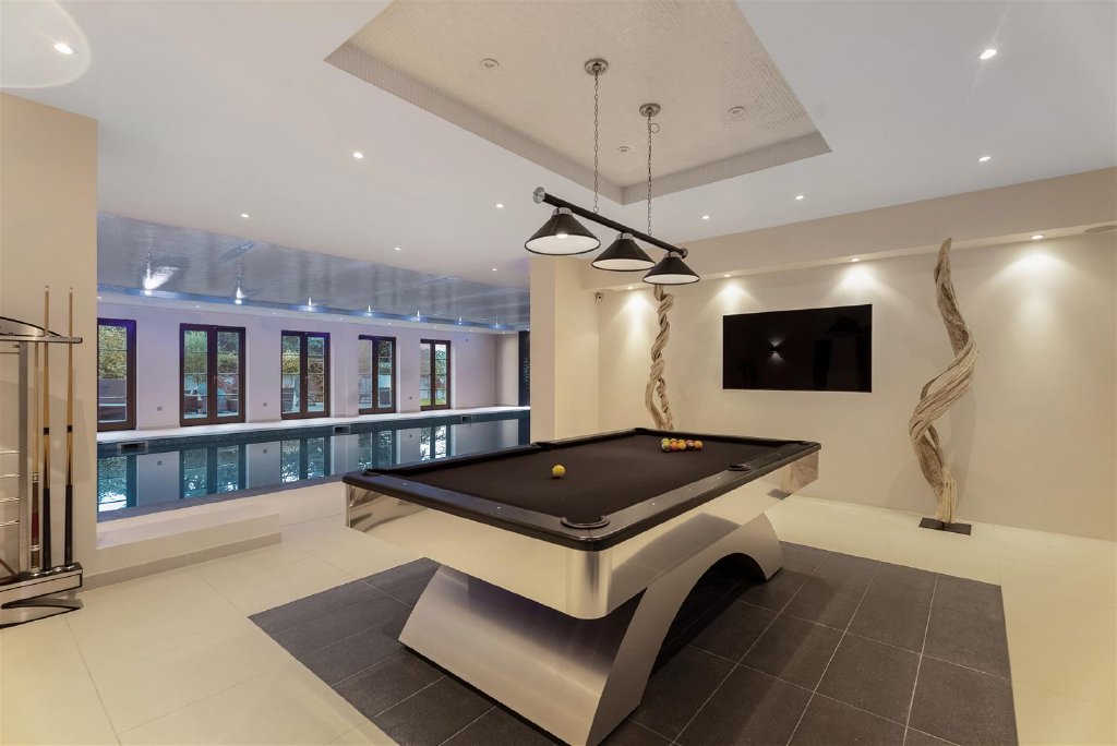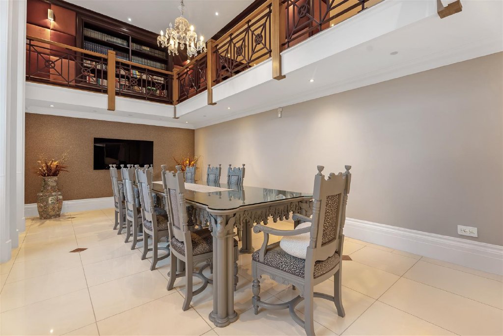 At the centre of family life sits the magnificent Clive Christian kitchen. With a dramatic double-height ceiling and expansive roof lights, it is both striking and supremely practical. A library mezzanine overlooks part of the breakfast area, creating a relaxed yet refined space for reading or quiet work. From here, the house opens effortlessly into the family room, which in turn leads directly into the newly refurbished swimming pool complex and annexe, perfect for year-round entertaining.