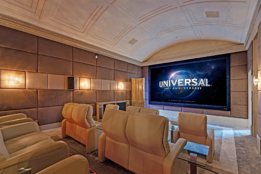 The ground floor is completed by a private study, Champagne bar/Snooker room, four car garage, cloakroom, powder room and a fully insulated cinema room with surround sound for evenings at home.