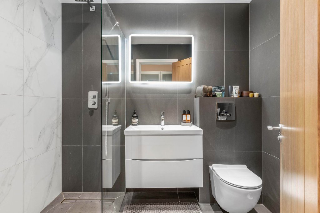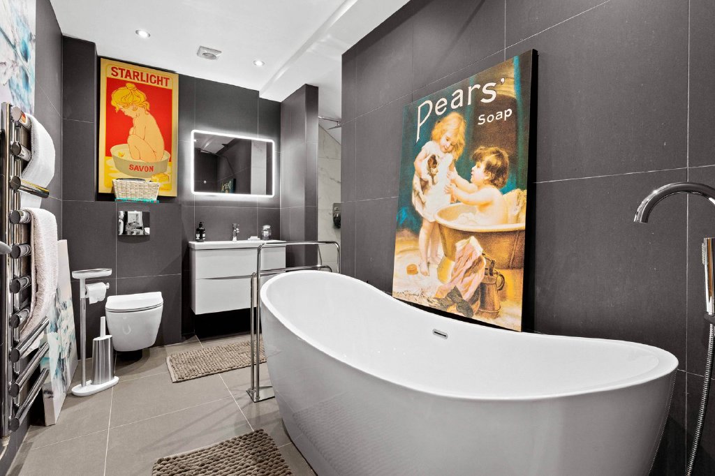 The property benefits from private secure parking for two vehicles, including electric vehicle charging, with gated access leading to a private terrace and the main entrance. A welcoming hallway features a utility cupboard and provides access to a striking 30ft kitchen/living/dining space, an exceptional room perfectly balancing high-specification modern design with the building’s industrial roots. The bespoke kitchen is fitted with built-in Neff appliances and the space opens onto the terrace, ideal for entertaining, complemented by a convenient cloakroom/WC. Off the hallway, there is an additional room which has the flexibility to be used as a home office, bedroom or a tv room.